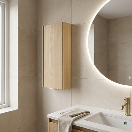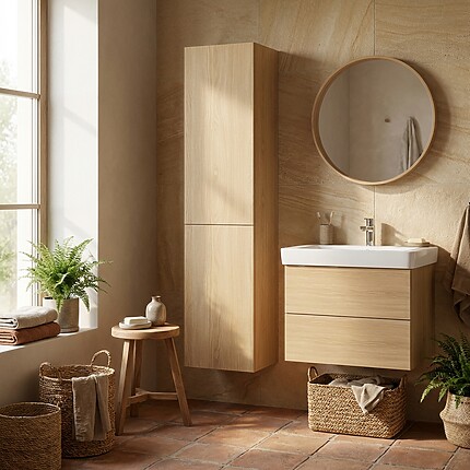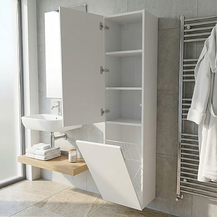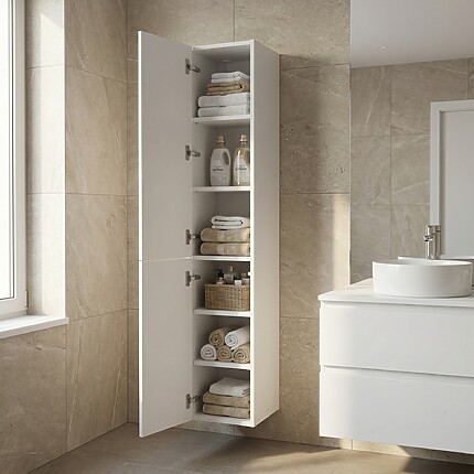 Táto vysoká skrinka je navrhnutá tak, aby maximálne využila vertikálny priestor v kúpeľni. S jej praktickým usporiadaním ponúka dostatok miesta na uskladnenie všetkých potrebných vecí, od uterákov po čistiace prostriedky. Skrinka je ideálna pre menšie kúpeľne, kde je potrebné efektívne využiť každý centimeter. Montáž skrinky na stenu zabezpečuje, že pod ňou zostane voľný priestor, čo uľahčuje údržbu a čistenie.