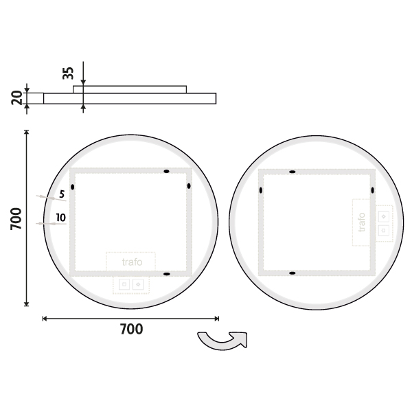Materiál konstrukce: Rám zrcadla a kryt zdroje jsou vyrobeny z hliníku