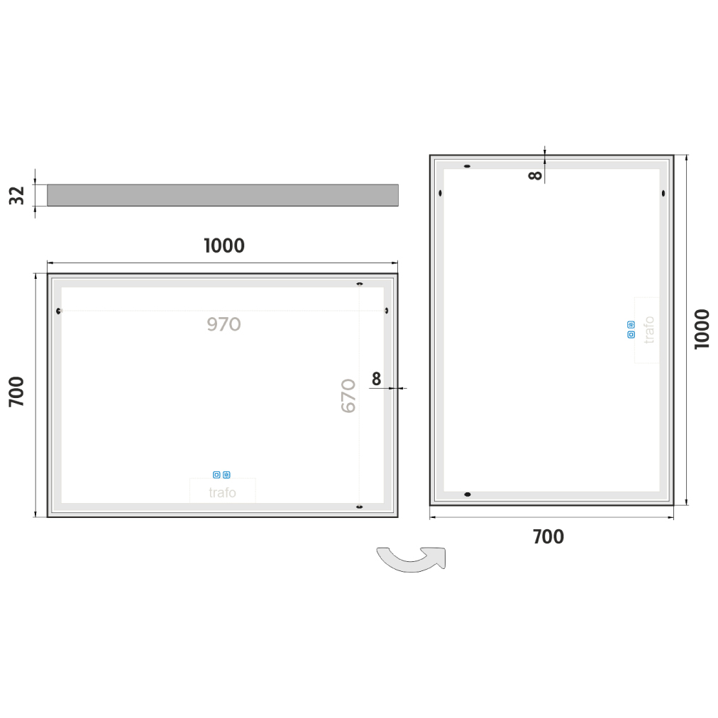 Pro dosažení kvalitního a rovnoměrného svícení je použit akrylový difuzor, který zajišťuje měkký a harmonický rozptyl světla bez viditelných bodových zdrojů. LED diody jsou vkusně integrovány do rámu spolu s difuzorem, což přispívá k elegantnímu a čistému vzhledu zrcadla.