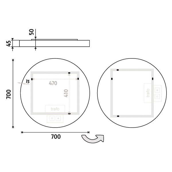 Materiál konstrukce: Rám zrcadla a kryt zdroje jsou vyrobeny z hliníku