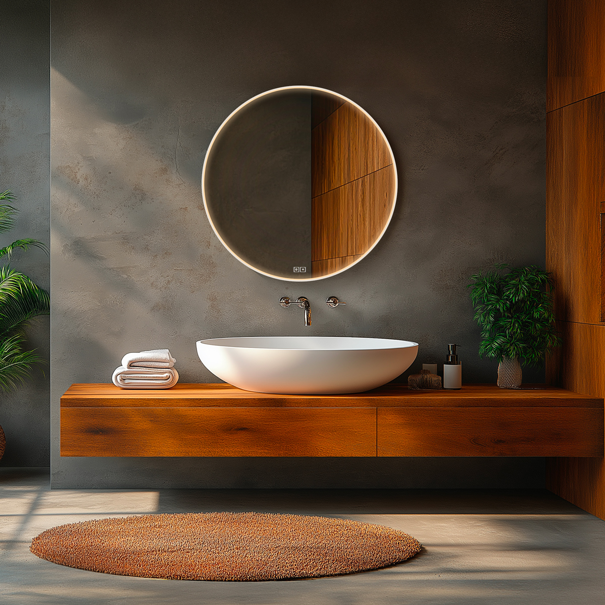 Kulaté zrcadlo s rámem a s celoobvodovým svícením pro dokonalé a rovnoměrné osvětlení.