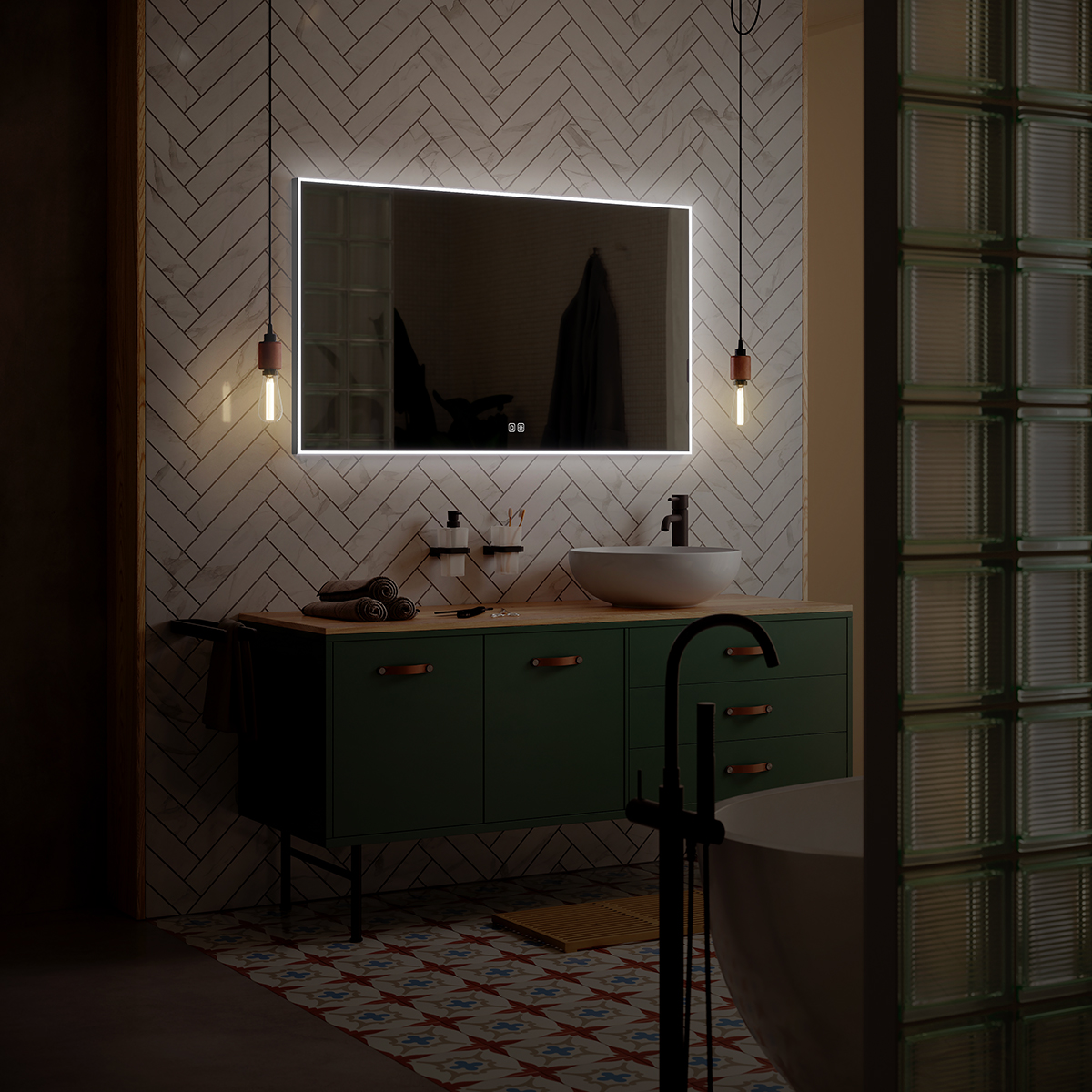 Obdélníkové zrcadlo s rámem s ostrými rohy a celoobvodovým svícením pro dokonalé a rovnoměrné osvětlení.