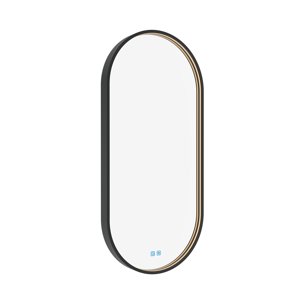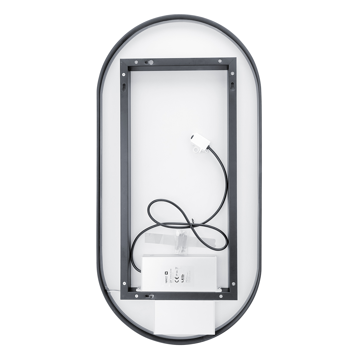 Oválné zrcadlo s rámem a s celoobvodovým svícením pro dokonalé a rovnoměrné osvětlení.