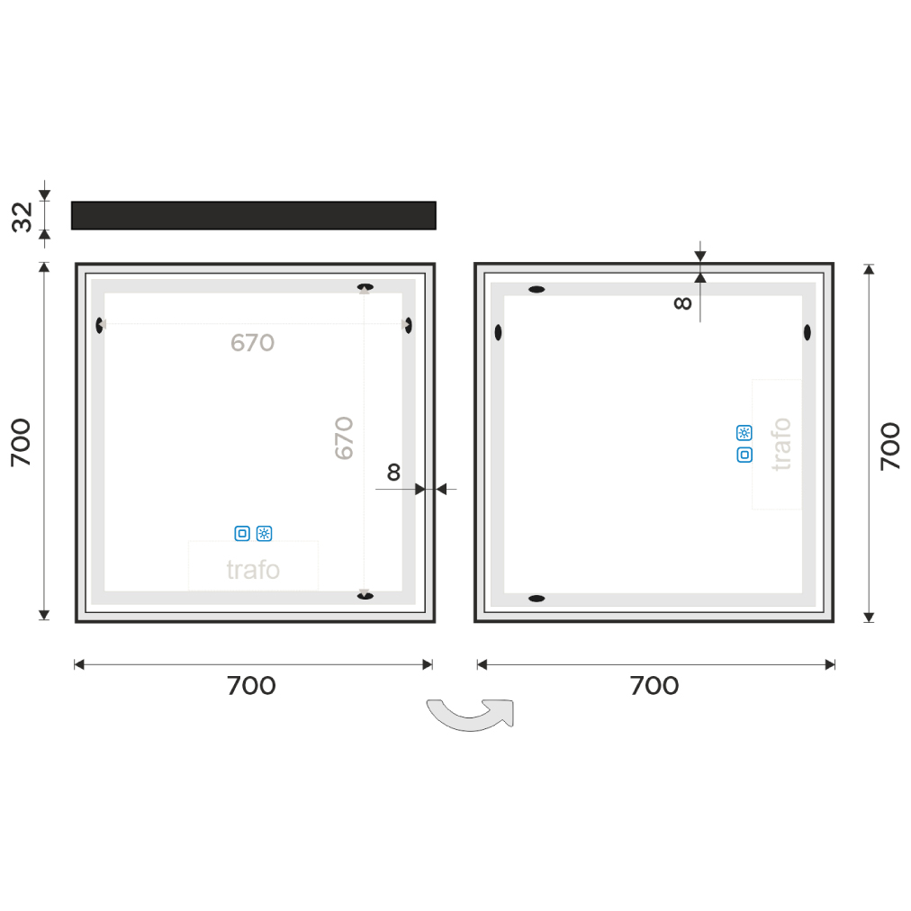 Pro dosažení kvalitního a rovnoměrného svícení je použit akrylový difuzor, který zajišťuje měkký a harmonický rozptyl světla bez viditelných bodových zdrojů. LED diody jsou vkusně integrovány do rámu spolu s difuzorem, což přispívá k elegantnímu a čistému vzhledu zrcadla.
