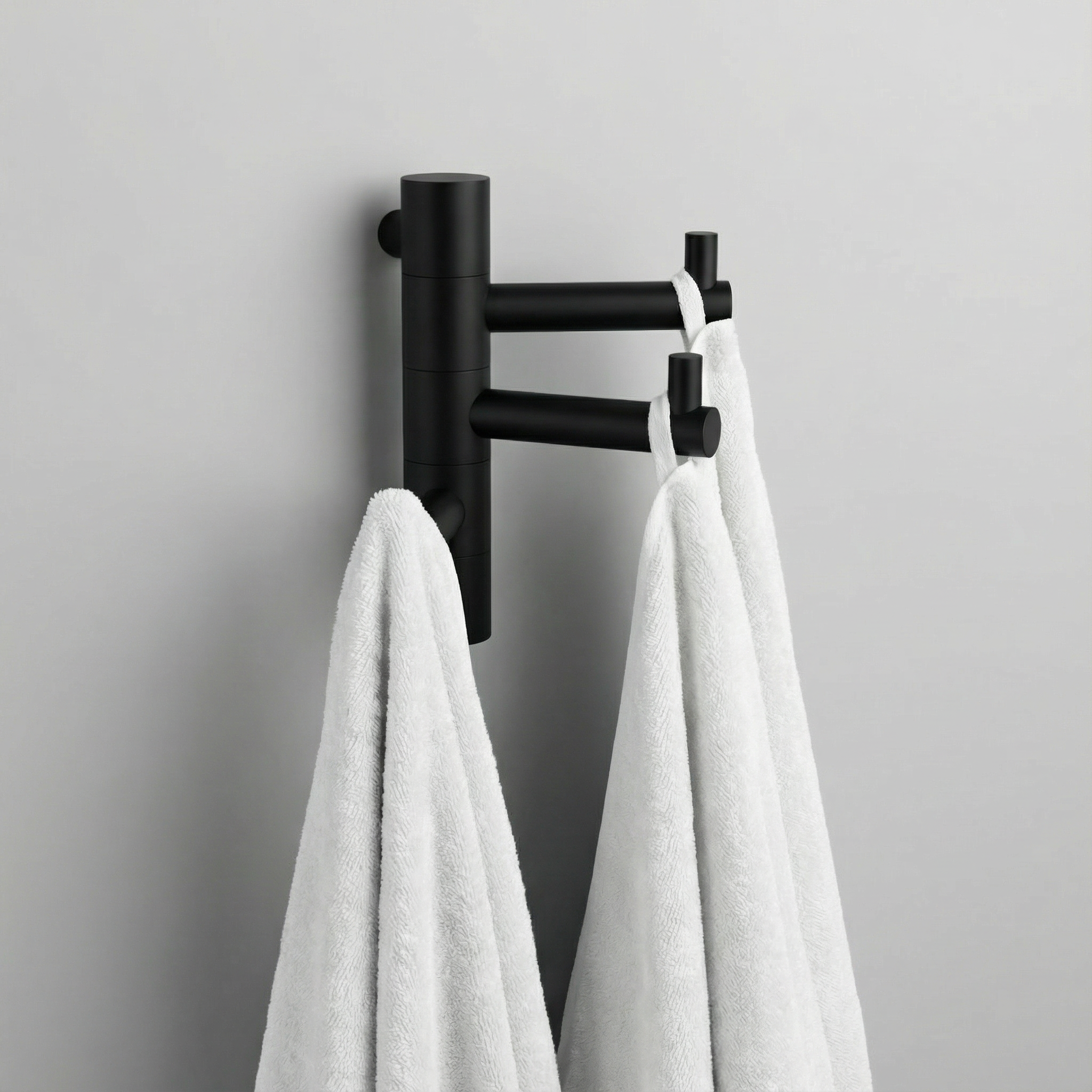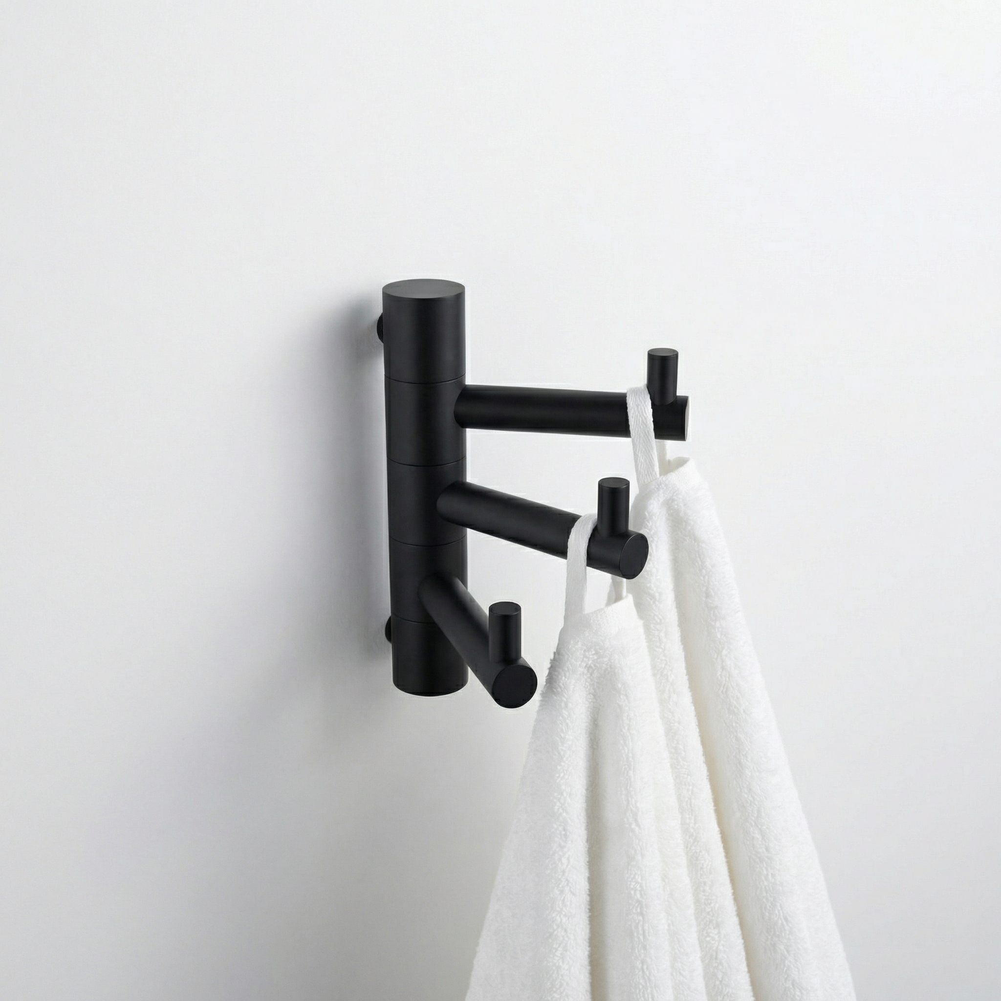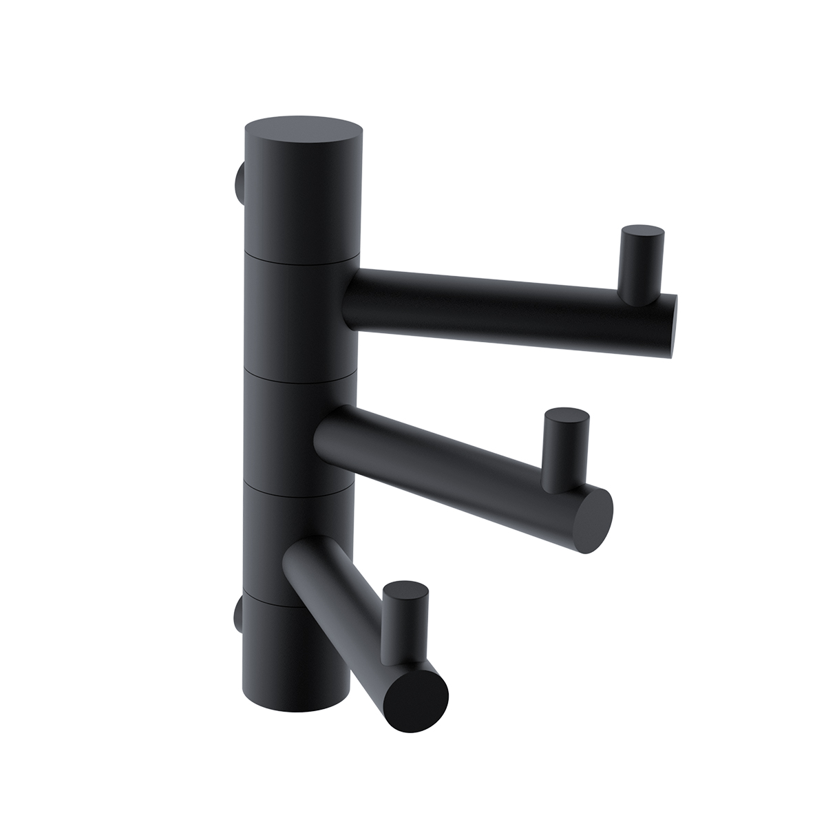 Černý věšák do koupelny na stěnu se třemi háčky, otočný, je skvělým doplňkem do koupelny. Spojení jednoduchosti s čistými liniemi a tvary přesně vystihuje sérii koupelnových doplňků Bormo černá. Prostý design této řady v sobě skloubil nadčasový vzhled, spolu s funkčností každého výrobku. Bormo černá nabízí prostředí plné harmonie a jednoduchosti, které z vaší koupelny vykouzlí místo, kde se budete cítit báječně a kde je relaxace zaručena.