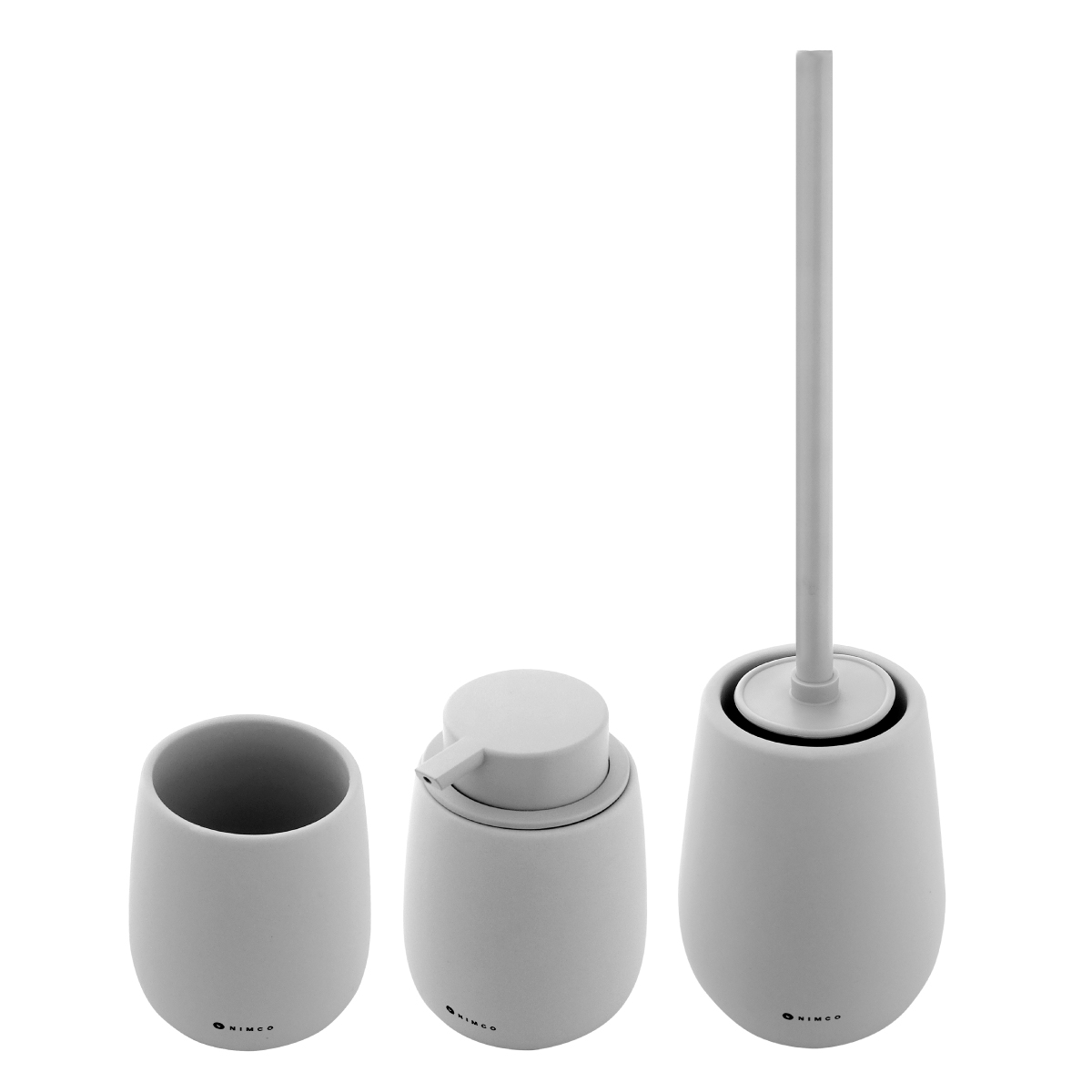 Sada doplňků do koupelny a WC obsahuje dávkovač tekutého mýdla, pohárek na zubní kartáčky a WC kartáč. Nádobky keramické světle šedé matné. Soft-touch povrch. Speciální dodatečná povrchová úprava. Povrch je hebký, příjemný na dotek.
