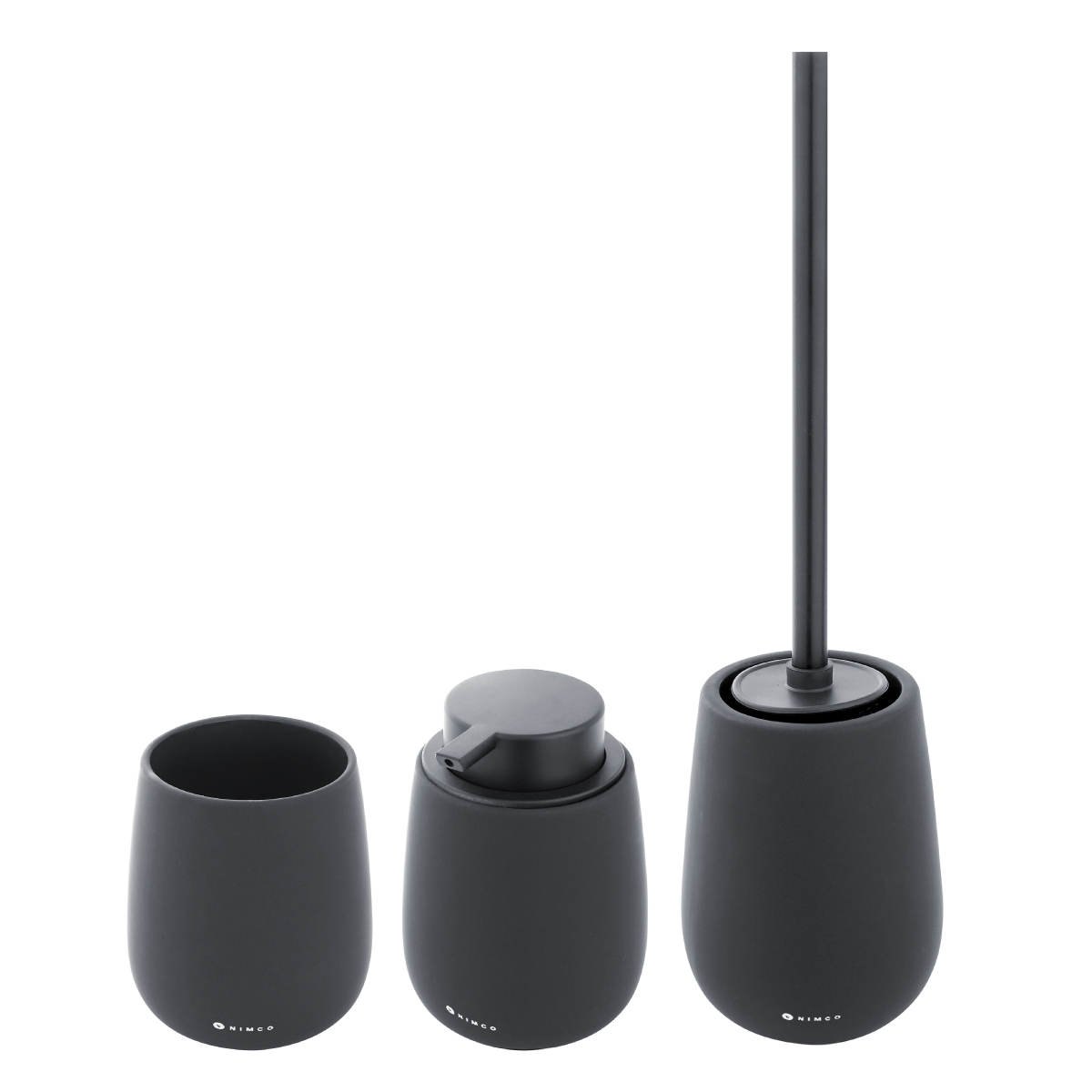 Sada doplňků do koupelny a WC obsahuje dávkovač tekutého mýdla, pohárek na zubní kartáčky a WC kartáč. Nádobky keramické černé matné. Soft-touch povrch. Speciální dodatečná povrchová úprava. Povrch je hebký, příjemný na dotek.
