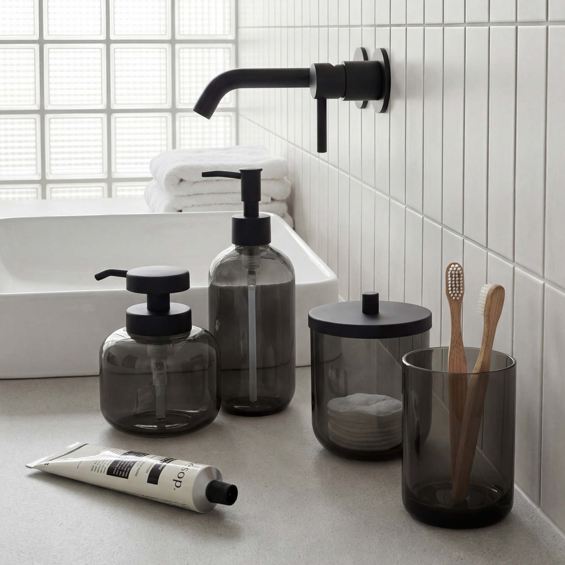 Nová elegantní skleněná série ABU přináší do vaší koupelny moderní a harmonický vzhled. Už nemusíte mít po vaně a umyvadle roztroušené různé plastové barevné lahvičky. Se sérií ABU bude vaše koupelna neustále čistá a uspořádaná. Sklo dodává koupelně eleganci a nadčasovost. Doporučujeme dokoupit podnos na skleněné nádobky AB 70. S touto kolekcí proměníte svou koupelnu v prostor, který je stylový, praktický a vždy dokonale uklizený.
