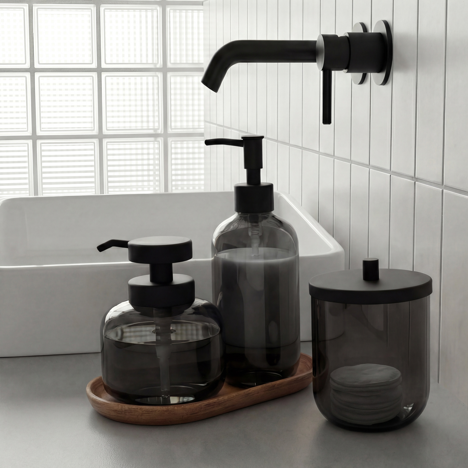 Nová elegantní skleněná série ABU přináší do vaší koupelny moderní a harmonický vzhled. Už nemusíte mít po vaně a umyvadle roztroušené různé plastové barevné lahvičky. Se sérií ABU bude vaše koupelna neustále čistá a uspořádaná. Sklo dodává koupelně eleganci a nadčasovost. Doporučujeme dokoupit podnos na skleněné nádobky AB 70. S touto kolekcí proměníte svou koupelnu v prostor, který je stylový, praktický a vždy dokonale uklizený.