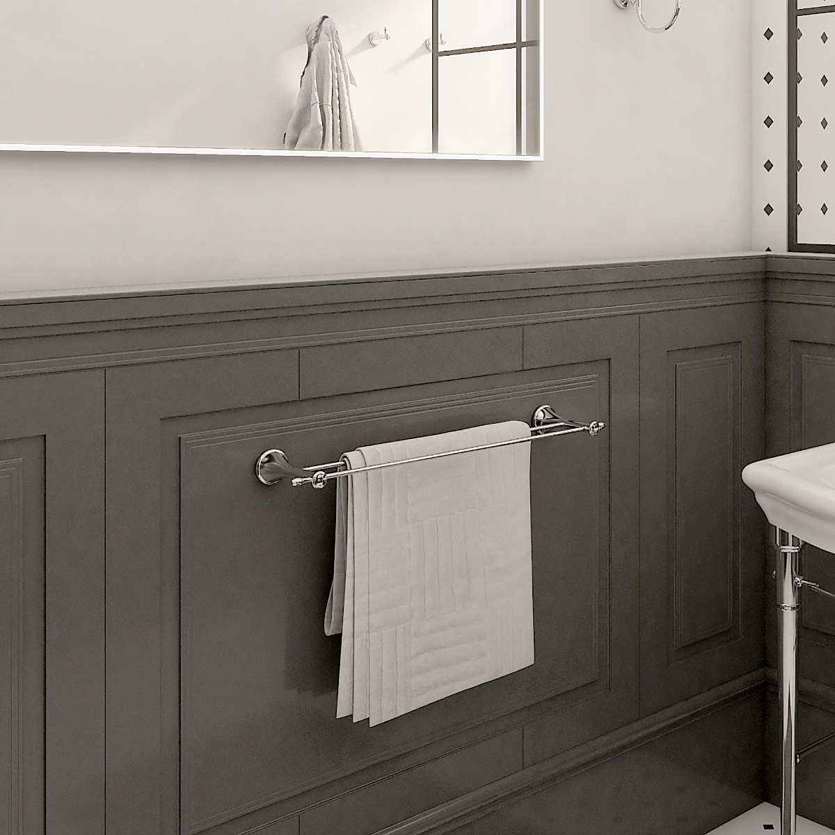 Držák na ručníky v retro stylu, 52 cm je skvělým doplňkem do koupelny. Interiér koupelny v retro stylu se vyznačuje svou elegancí s romantickým nádechem. Dává přednost vícero střídmým dekoracím a zaměřuje se na preciznost detailu. Máte-li v plánu zařídit si retro koupelnu, série LADA je tu právě pro vás.