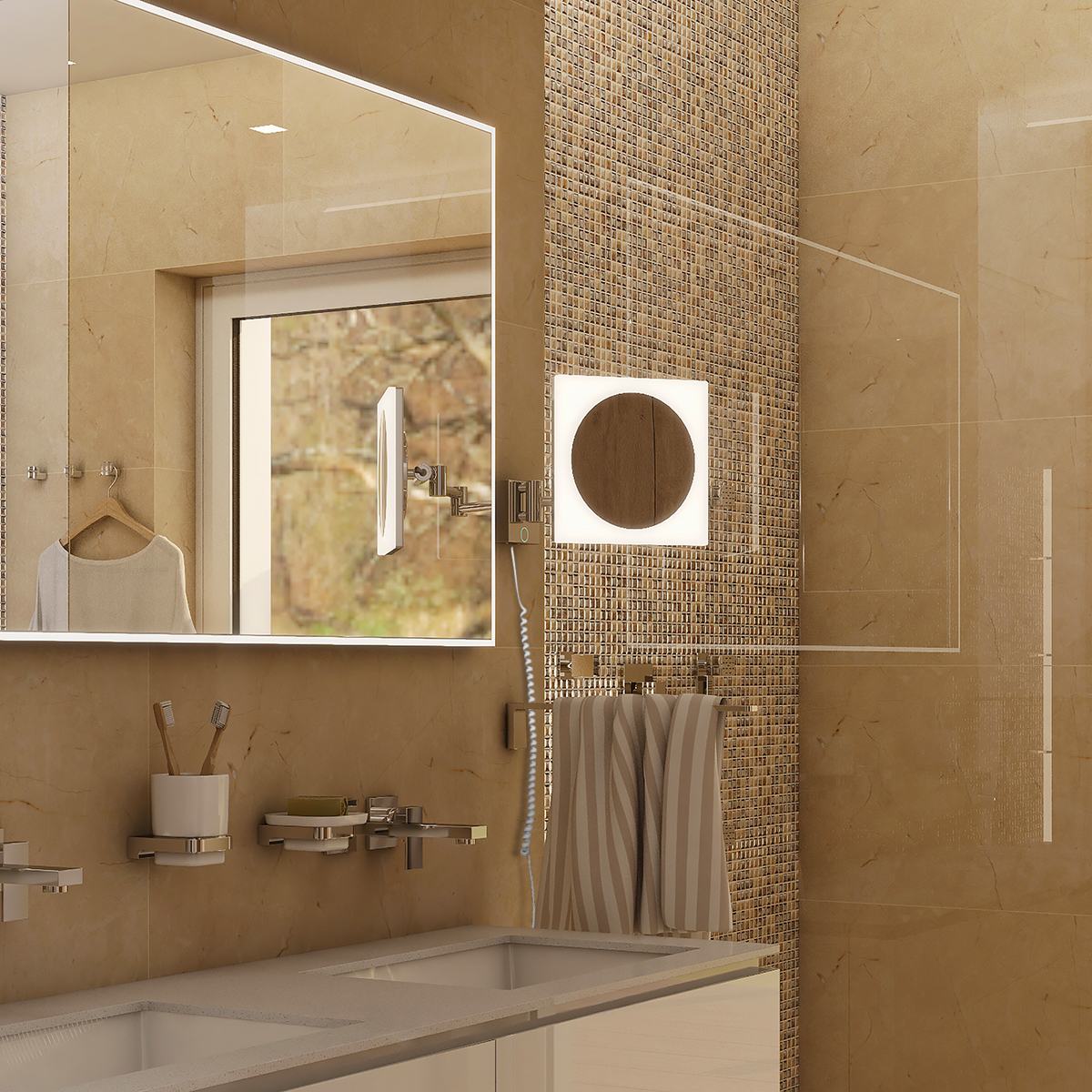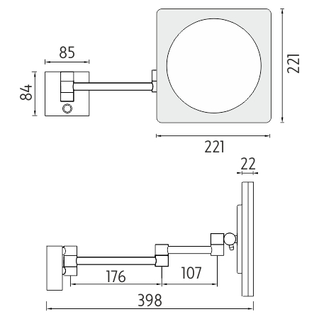 Zrcátko se připevňuje na stěnu, ideálně do blízkosti hlavního koupelnového zrcadla. Je umístěné na skládacím rameni v lesklé chromové úpravě, díky jemuž je neustále v pohotovosti a zároveň ve složeném stavu nepřekáží.
