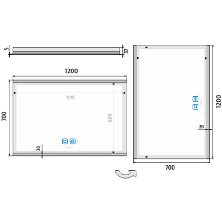 Konstrukce podsvícení: K rovnoměrnému rozptylu světla zrcadlo disponuje difuzorem z akrylového skla