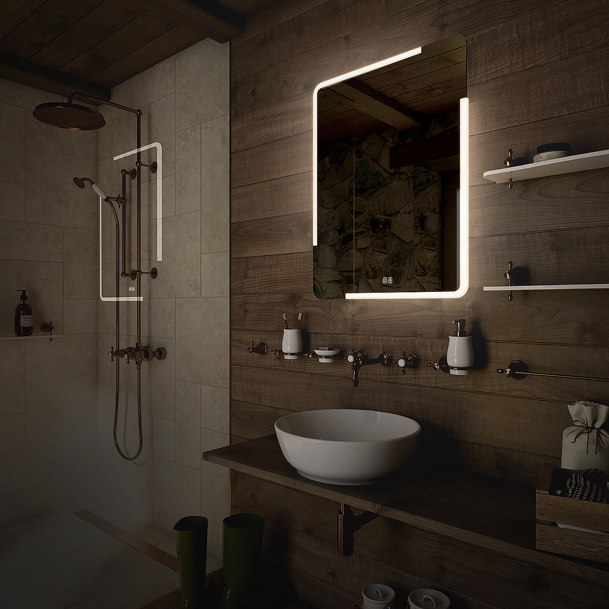 Obdélníkové bezrámové zrcadlo s oblými rohy a celoobvodovým podsvícením pro dokonalé a rovnoměrné osvětlení.