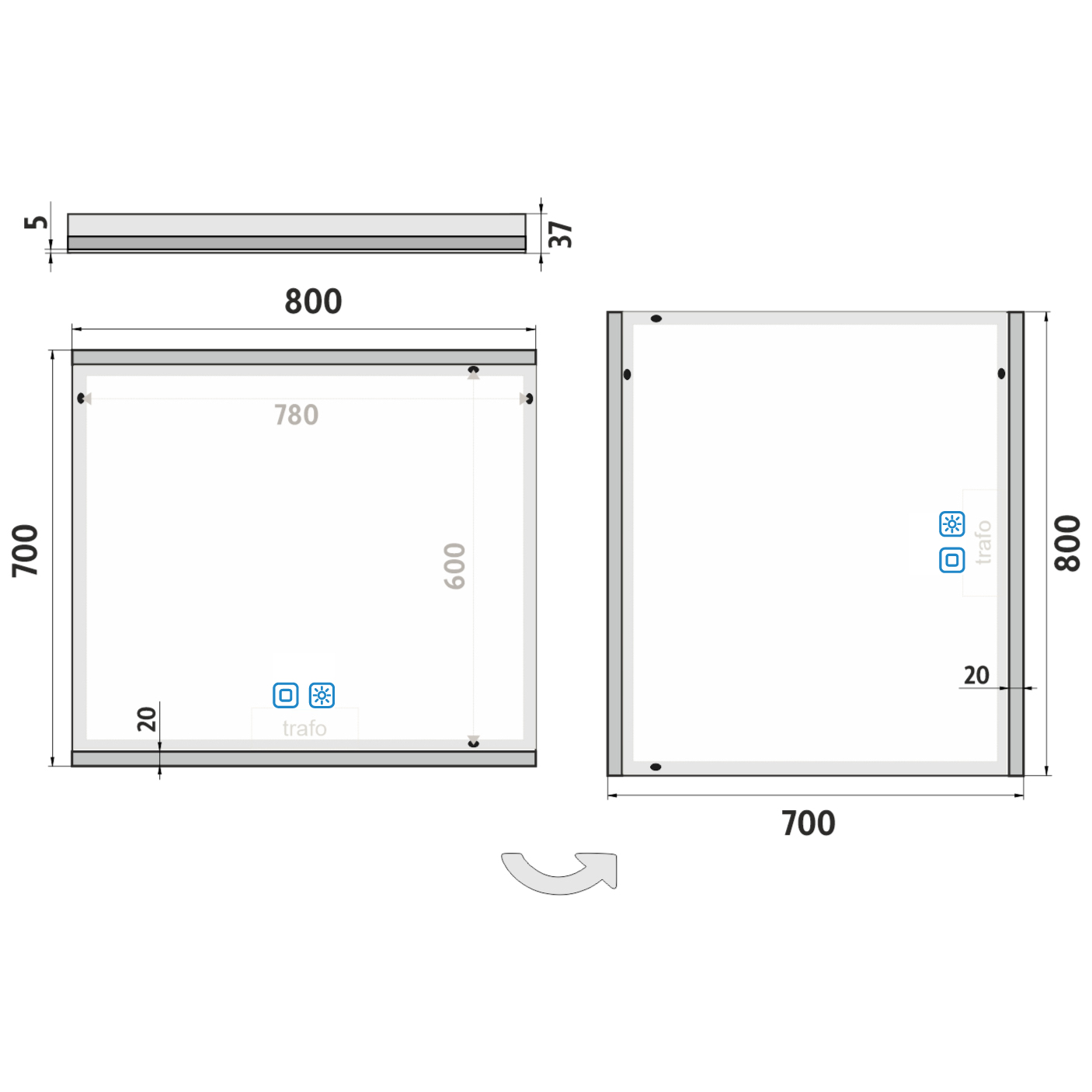 Nimco LED zrcadlo 800×700 se dvěma dotykovými senzory