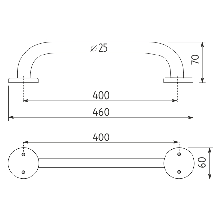 Koupelnové madlo 40 cm x 25 mm do koupelny, sprchy, pro seniory je skvělým doplňkem do koupelny. Často bývá koupelně vyčleněna jen opravdu malá plocha. A právě proto, že v této často nejmenší místnosti nebývá příliš prostoru pro estetické doplňky, měli bychom zaostřit svoji pozornost především na předměty, které plní konkrétní funkce. Řešením může být právě některý z následujících výrobků. Uchycení madla na každé straně dvěma šrouby. Vzdálenost mezi šrouby 400 mm. Rozteč mezi šrouby na jedné straně 45-52 mm.