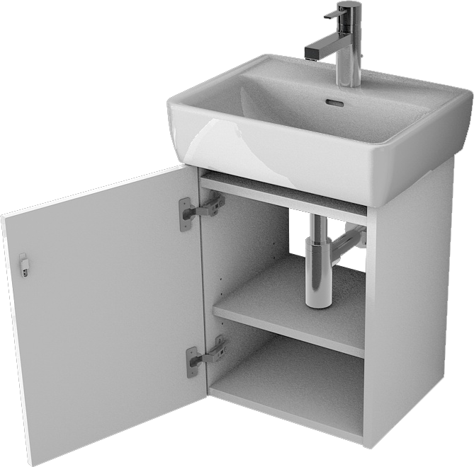 Podumývadlová skrinka s dvierkami otváranými dotykom určená pod umývadlo Laufen PRO A 45. Dotykové otv. je možno zameniť za tlmené zatváranie za cenu úchytky.
