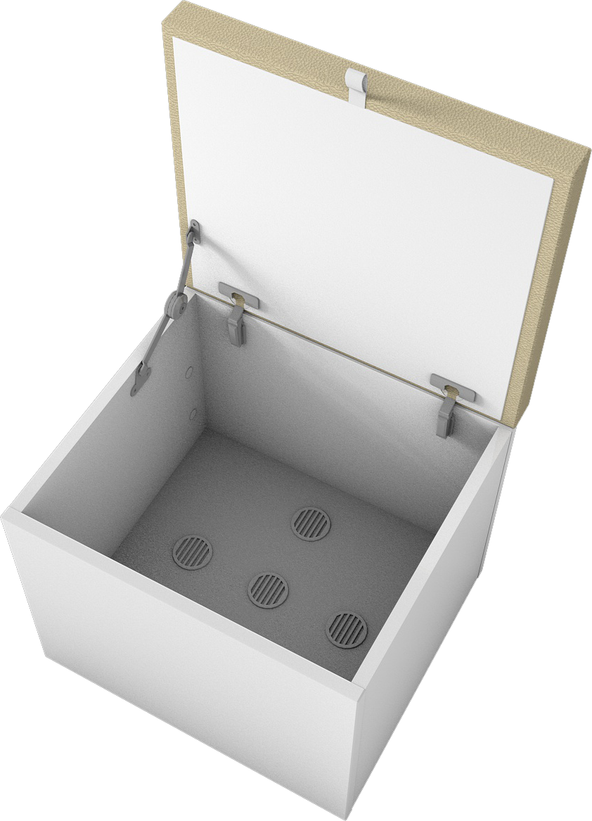 Horná doska taburetky je výklopná, pod ktorou sa nachádza praktický úložný priestor ideálny na špinavú bielizeň alebo iné predmety. Vetracie mriežky zabezpečujú cirkuláciu vzduchu, čím predchádzajú vzniku nepríjemných pachov.