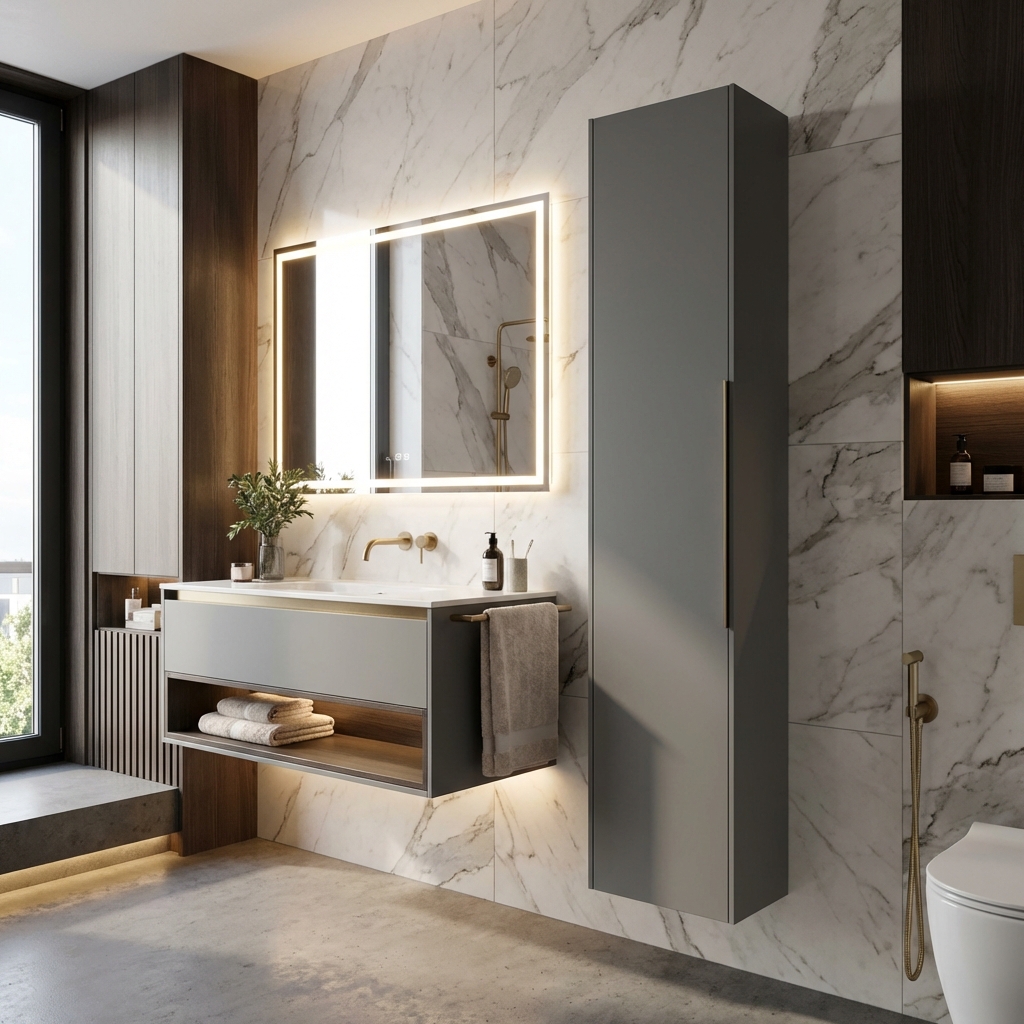 Vysoká skrinka zo série THIN je ideálnym doplnkom pre každú modernú kúpeľňu, ktorá kombinuje funkčnosť s estetikou. S jej pomocou si môžete usporiadať všetky potrebné veci pre každodenné používanie a udržať tak vašu kúpeľňu vždy upratanú a prehľadnú.