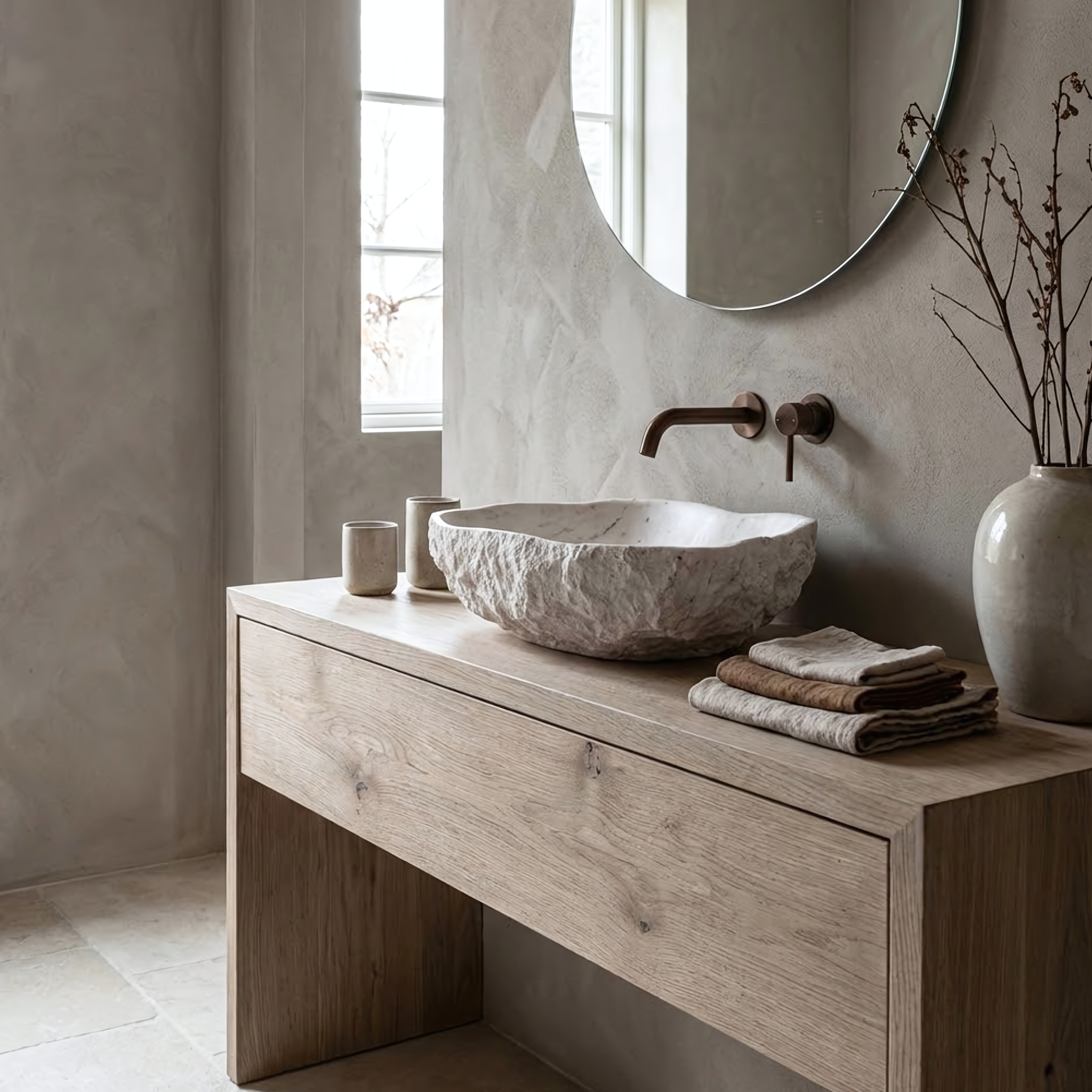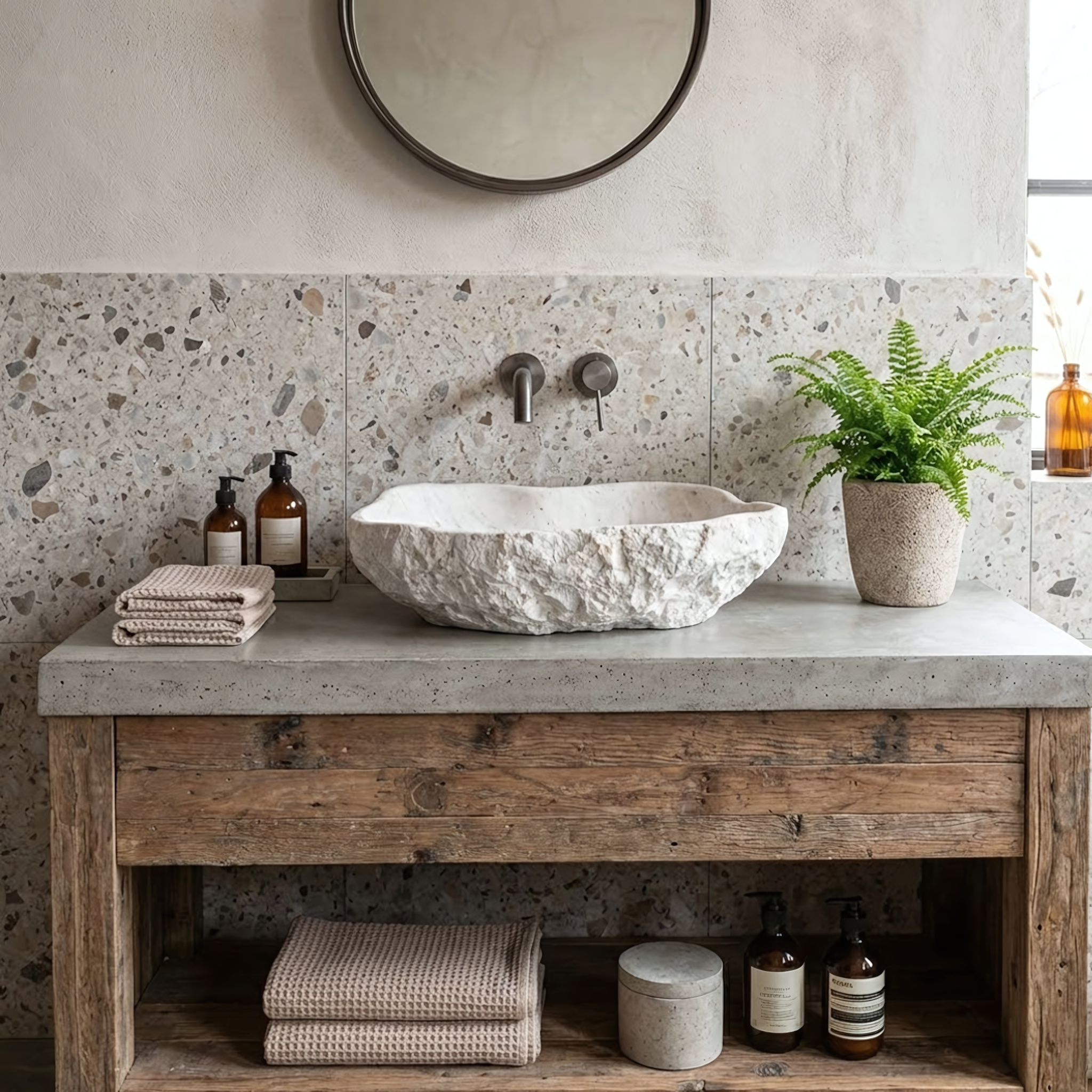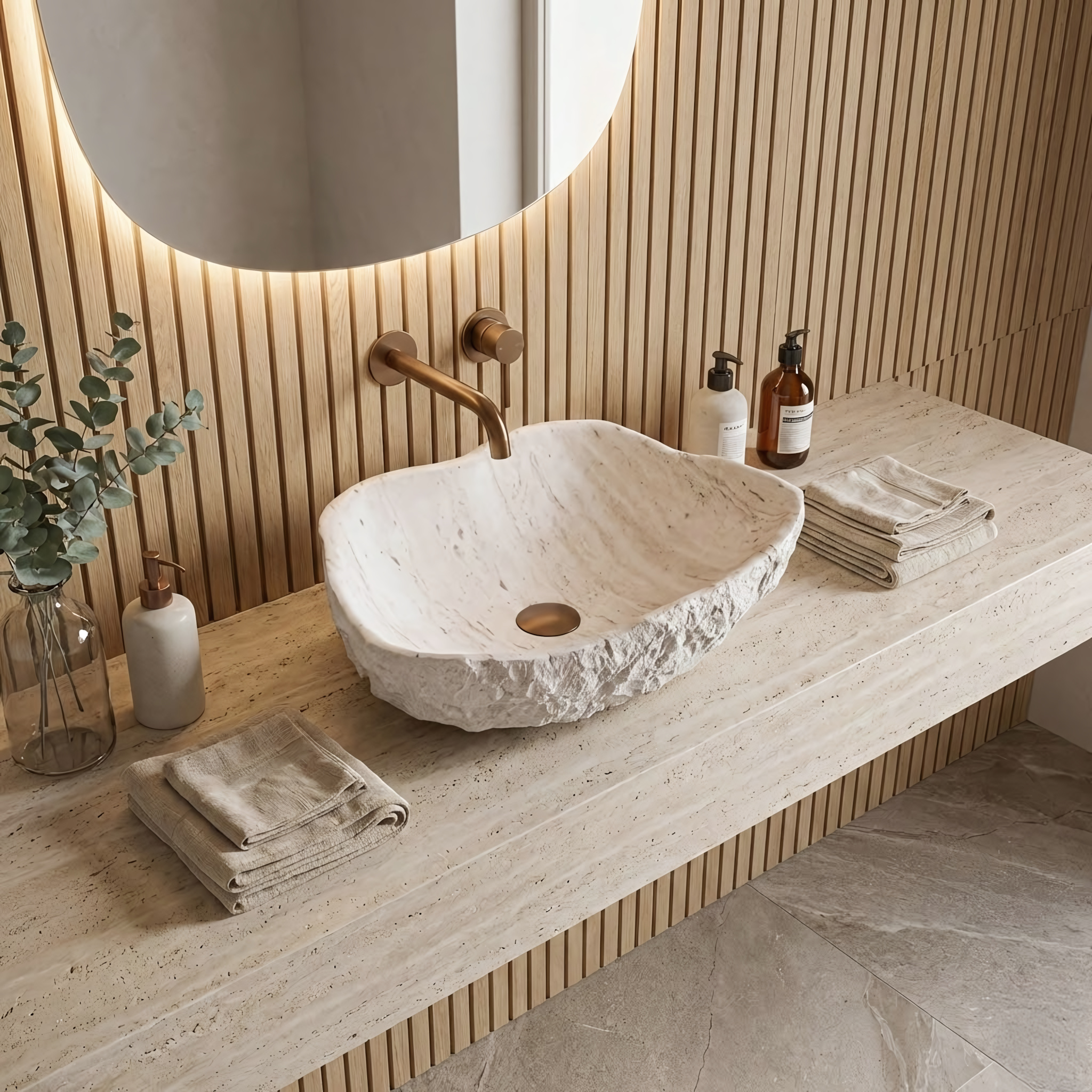 Vytvorte si v kúpeľni zónu relaxu s umývadlom na dosku Rea Isla Shiro. Tento výnimočný model upúta pozornosť nepravidelnou, organickou formou a povrchovou úpravou imitujúcou svetlý kameň. Vyrobené z kompozitného umelého kameňa Artificial Stone, spája surovú estetiku s modernou odolnosťou. Štruktúra kameňa – vonkajší povrch misy má výraznú, drsnú textúru pripomínajúcu tesanú skalu, čo jej dodáva autentický, remeselný charakter. Materiál Artificial Stone – použitý kompozit je mimoriadne pevný a odolný voči mechanickému poškodeniu, zároveň je príjemnejší a teplejší na dotyk než prírodný kameň. Prirodzená farebnosť – svetlý odtieň s jemným vzorom imituje štruktúru usadenej horniny alebo pieskovca a vnáša do interiéru pokoj a harmóniu Hladký vnútorný povrch – na rozdiel od surovej vonkajšej textúry je vnútro umývadla dokonale vyleštené, čo zabezpečuje jednoduché čistenie a plynulý odtok vody. Montáž na dosku – umývadlo je prispôsobené na umiestnenie na dosku alebo skrinku, vďaka čomu je jeho sochárska forma naplno vystavená. Umývadlo Rea Isla Shiro je skvelou voľbou do kúpeľní v štýle boho, spa aj modernom. Spojenie organického tvaru s odolnosťou kompozitu z neho robí efektný a zároveň praktický prvok vybavenia, ktorý narúša geometrickú strohosť interiéru.
