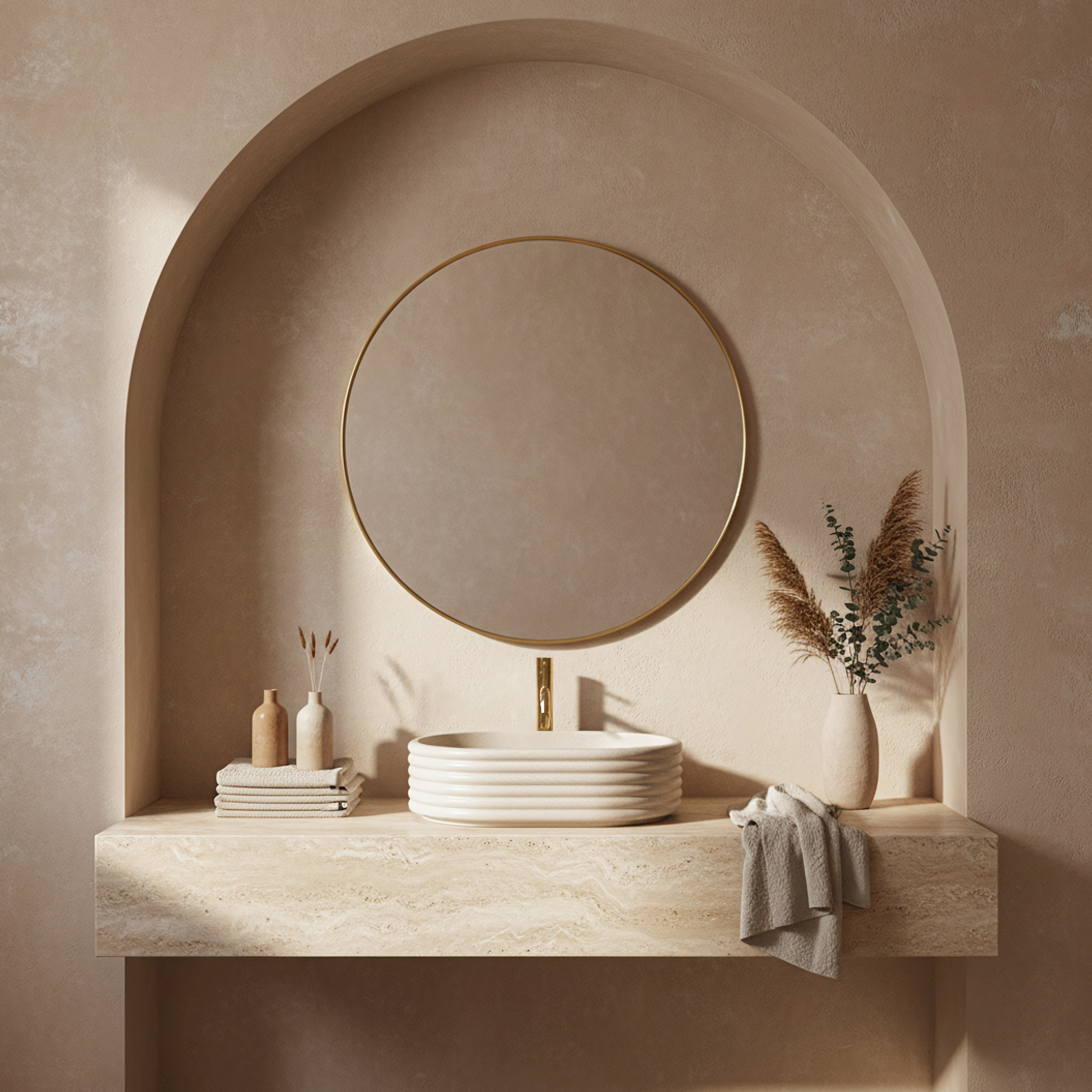 Vneste do svojej kúpeľne sviežosť a eleganciu s umývadlom na dosku Rea Nicoletta Beige. Tento model očarí jedinečnou štruktúrou založenou na horizontálnych líniách a svetlým, prírodným odtieňom. Vyrobené z odolného kompozitu Artificial Stone spája dekoratívny dizajn s dlhodobou funkčnosťou. Horizontálne drážkovanie – telo misy zdobia charakteristické vodorovné prstence. Tento trojrozmerný vzor dodáva tvaru moderný rytmus a odlišuje ho od štandardných umývadiel. Odtieň Beige Stone – svetlý béžový povrch je doplnený jemnou zrnitou textúrou, ktorá imituje prírodný pieskovec a vnáša do interiéru teplo a útulnosť. Materiál Artificial Stone – moderný kompozitný kameň zabezpečuje vysokú odolnosť proti mechanickému poškodeniu a zafarbeniu a je príjemnejší a teplejší na dotyk než tradičné materiály. Hladký vnútorný povrch – napriek drážkovanému vonkajšku je vnútro misy dokonale hladké a tvarované, čo uľahčuje každodenné čistenie a zabezpečuje voľný odtok vody. Montáž na dosku – model je určený na inštaláciu na dosku alebo skrinku, čo umožňuje naplno vyniknúť jeho dekoratívnej, drážkovanej forme. Umývadlo Rea Nicoletta Beige je výbornou voľbou pre interiéry v štýle boho, škandinávskom alebo japandi. Jeho teplá farebnosť a zaujímavá textúra z neho robia jemný, no výrazný prvok umývadlovej zóny.