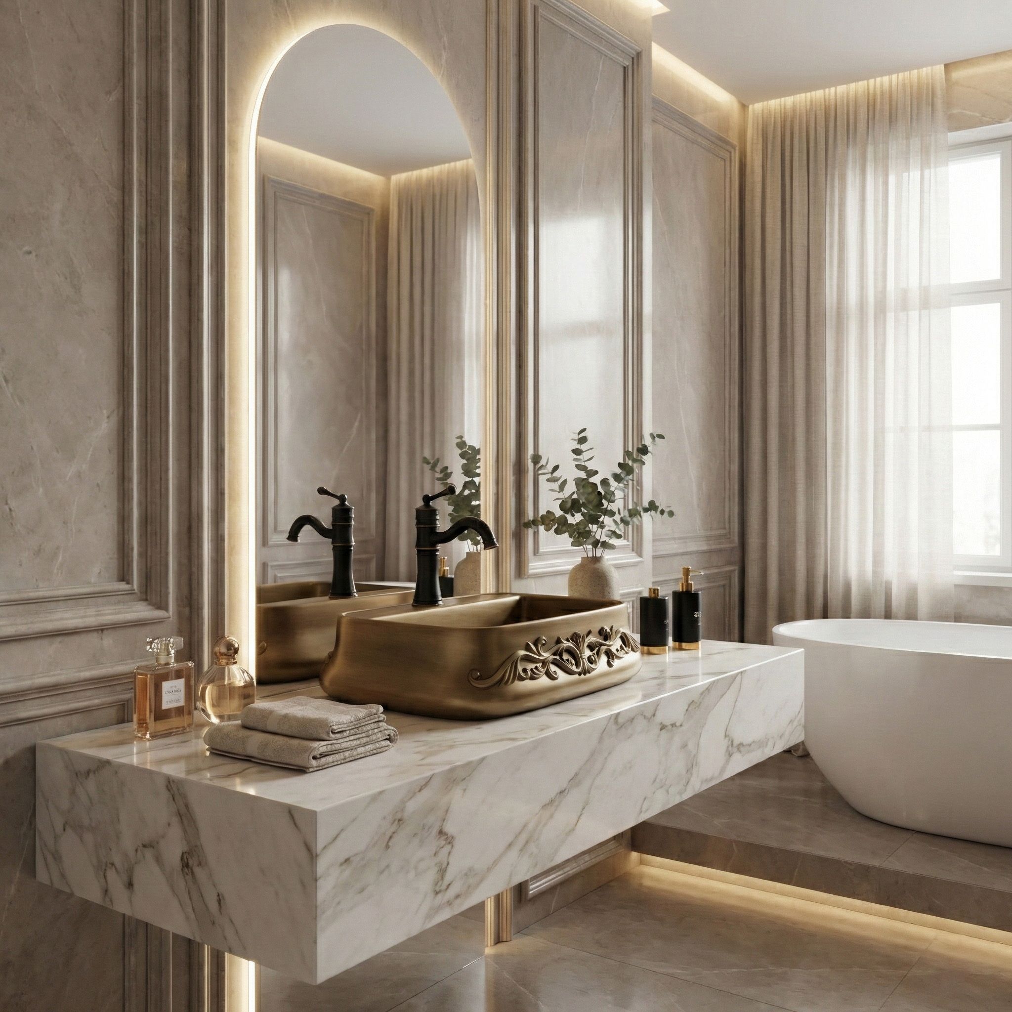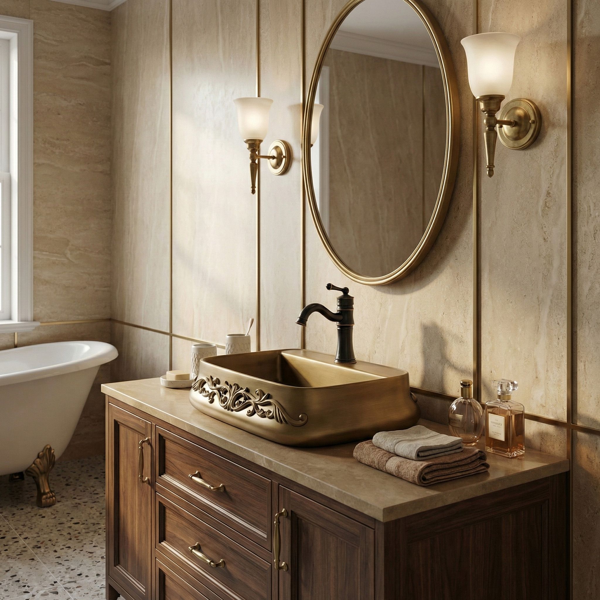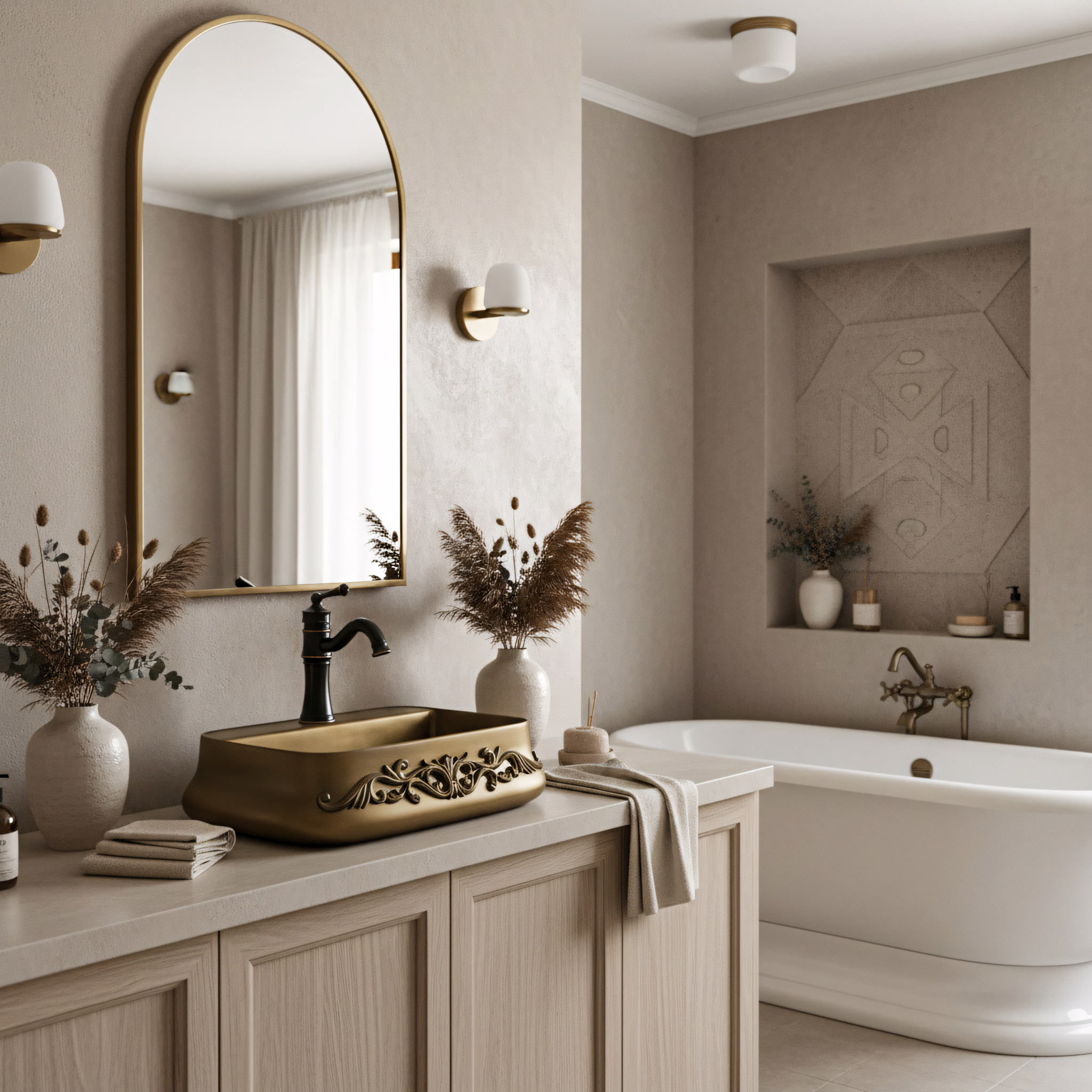 Vyber si keramické umývadlo na dosku Rea Castel, ak hľadáš výrazný, klasický akcent do svojej kúpeľne. Tento model je skvelou voľbou pre milovníkov retro, vintage a rustikálneho štýlu – spája funkčný tvar s mimoriadne efektným, bohatým zdobením. Výnimočné zdobenie (reliéf) – prednú časť umývadla zdobí vystúpený florálny ornament. Je to detail, ktorý okamžite pritiahne pozornosť a stane sa hlavným dekoratívnym bodom, čím dodá elegantný, remeselný charakter. Povrch v odtieni staromosadze – keramický povrch získal jedinečnú farbu patinovanej hnedej. Tento zámerný vizuálny efekt skvele podčiarkuje vintage štýl a dodáva celej forme ušľachtilosť. Polička s otvorom na batériu – model Castel má integrovanú poličku s továrensky vyrezaným otvorom. Umožňuje pohodlnú montáž stojankovej batérie priamo na umývadle, chráni dosku pred striekajúcou vodou a uľahčuje každodenné upratovanie. Odolná sanitárna keramika – umývadlo je vyrobené z klasickej, pevnej keramiky. Zaručuje jednoduchú údržbu, hladký vnútorný povrch a odolnosť voči zafarbeniu. Montáž na dosku – inštalácia priamo na skrinku alebo dosku umožní naplno vyniknúť ozdobnej obvodovej časti a plynulo tvarovaným hranám umývadla. Umývadlo Rea Castel je výrazný detail, ktorý úplne zmení charakter aranžmánu. Jeho bohatá ornamentika a teplá farebnosť sa skvelo hodia do kúpeľní v klasickom, „kaštieľnom“ či eklektickom štýle a vytvoria súdržný, štýlový priestor.