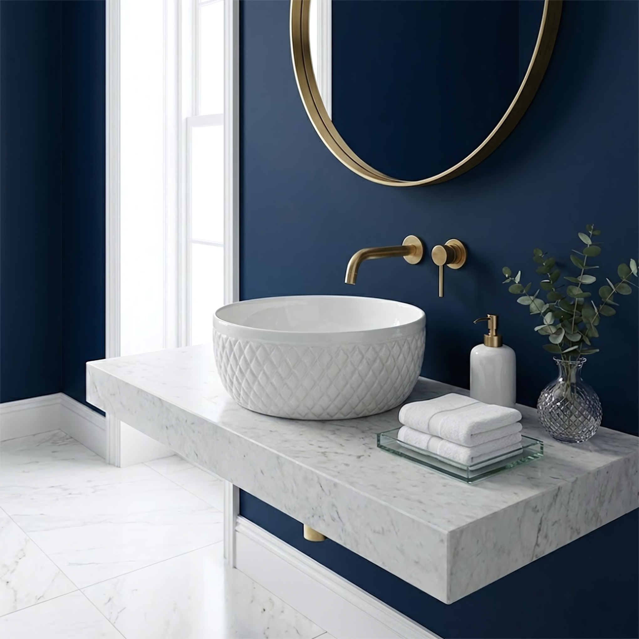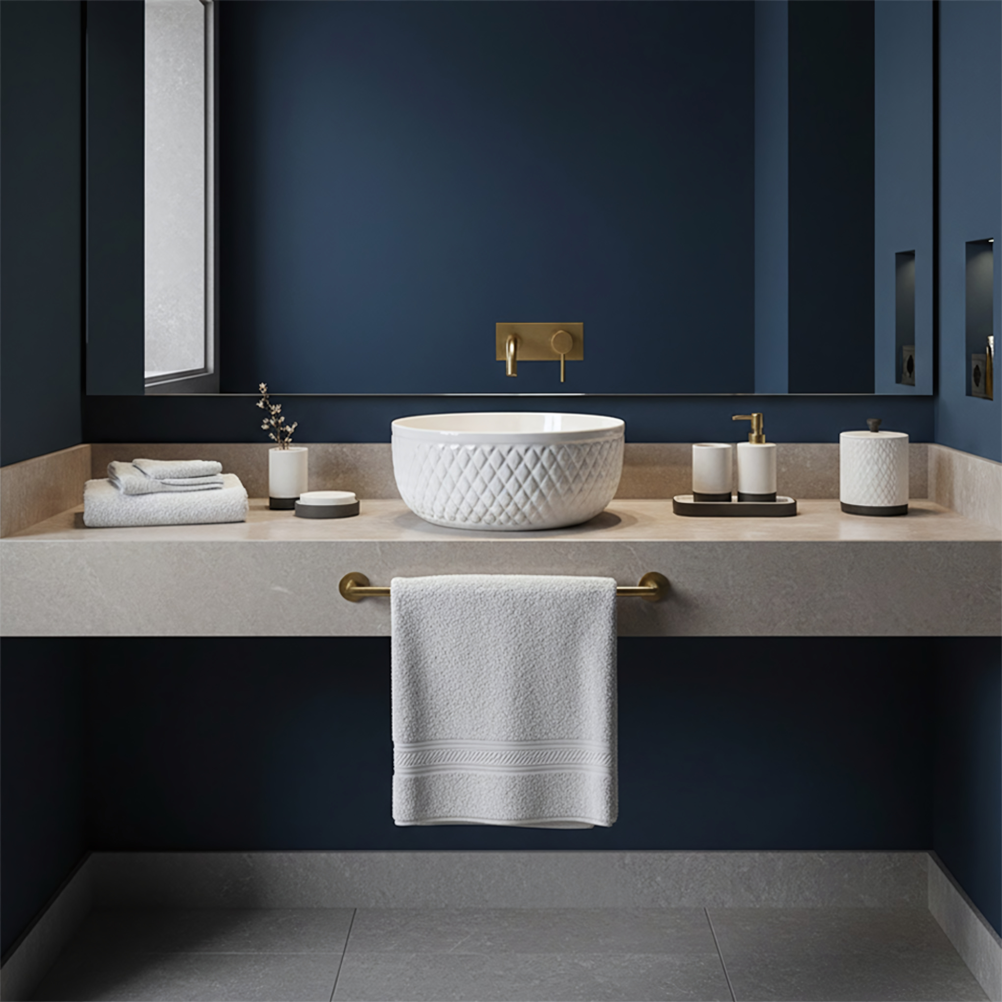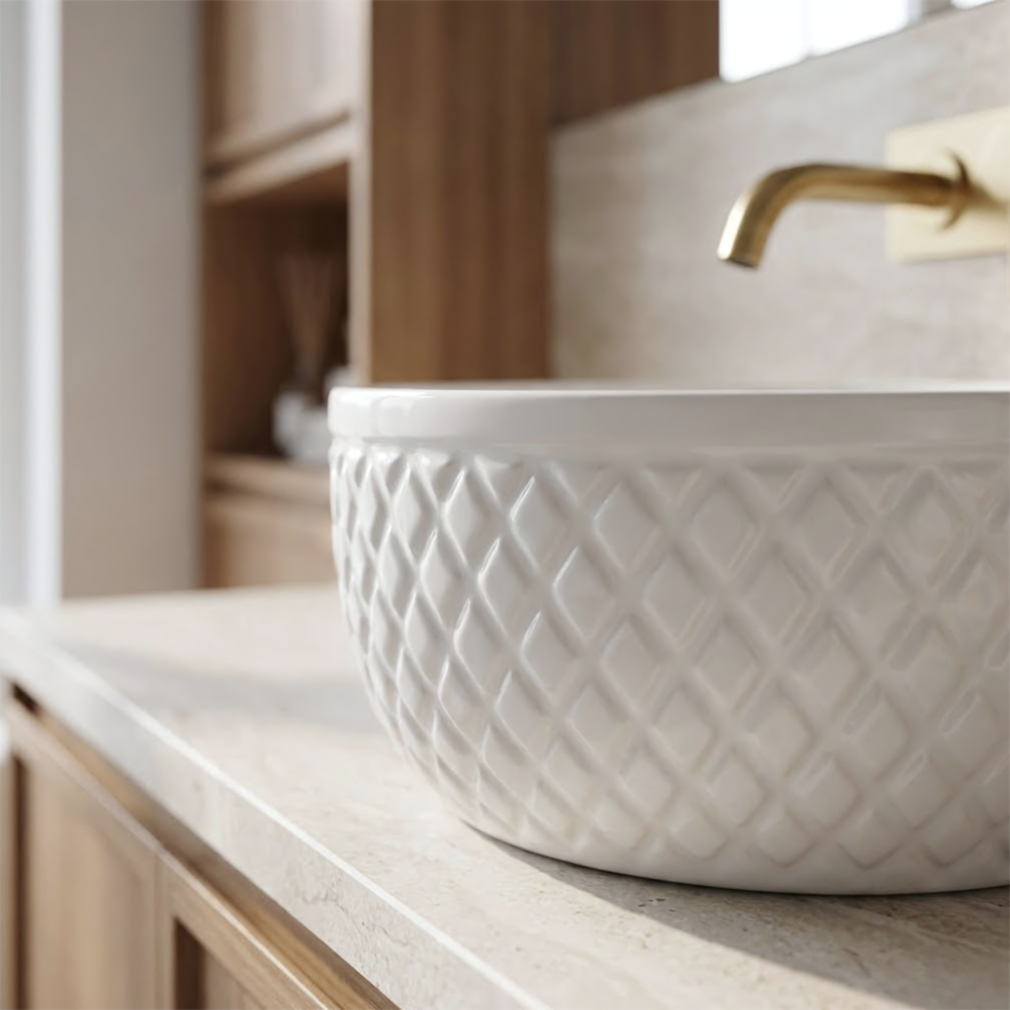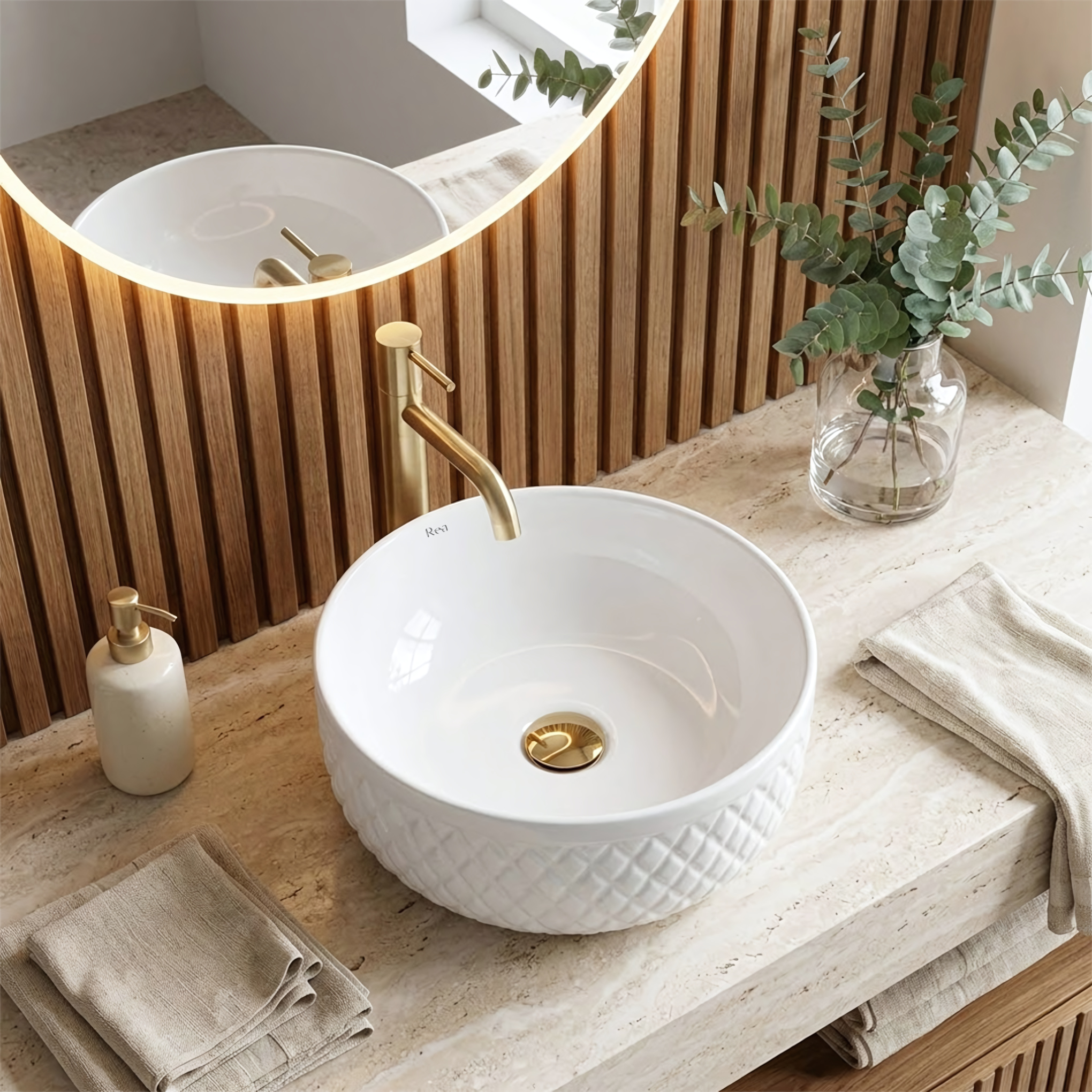 Podčiarknite elegantný charakter svojej kúpeľne s umývadlom na dosku Rea Galaxy. Tento model spája klasickú bielu s dekoratívnou formou, ktorá upúta pozornosť. Vonkajšie steny misy zdobí ryhovaná štruktúra v romboch, vďaka čomu keramika pôsobí ako luxusný doplnok v glamour štýle. Dekoratívna textúra – vonkajší povrch umývadla má výrazné geometrické reliéfy pripomínajúce prešívanie, ktoré vytvárajú efektnú hru svetla a tieňa a oživujú interiér. Optimálna výška – misa je hlbšia než štandardné modely. Tento rozmer znižuje rozstrekovanie vody a je ideálny na kombináciu s vysokými stojankovými alebo podomietkovými batériami. Biela keramika – vyhotovenie z vysokokvalitnej glazovanej sanitárnej keramiky zaručuje dlhú životnosť, bezchybný lesk a odolnosť proti poškriabaniu. Hladké vnútro – na rozdiel od dekoratívneho plášťa je vnútro misy dokonale hladké, čo uľahčuje každodenné čistenie a zabezpečuje hygienu. Montáž na dosku – umývadlo je určené na umiestnenie na dosku alebo skrinku a stáva sa výrazným centrálnym prvkom umývacej zóny. Umývadlo Rea Galaxy je voľbou pre tých, ktorí chcú v kúpeľni prelomiť minimalizmus. Jeho šperkový dizajn sa výborne kombinuje s elegantnými doplnkami a spája praktické výhody hlbokej misy s jedinečným štýlom.
