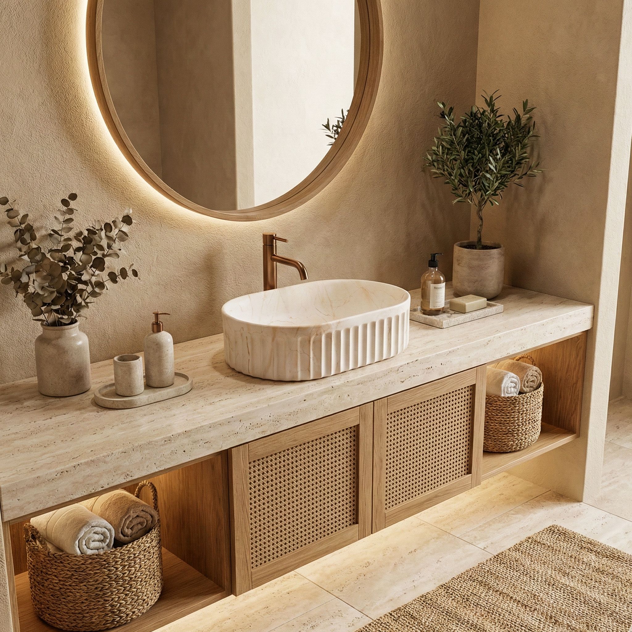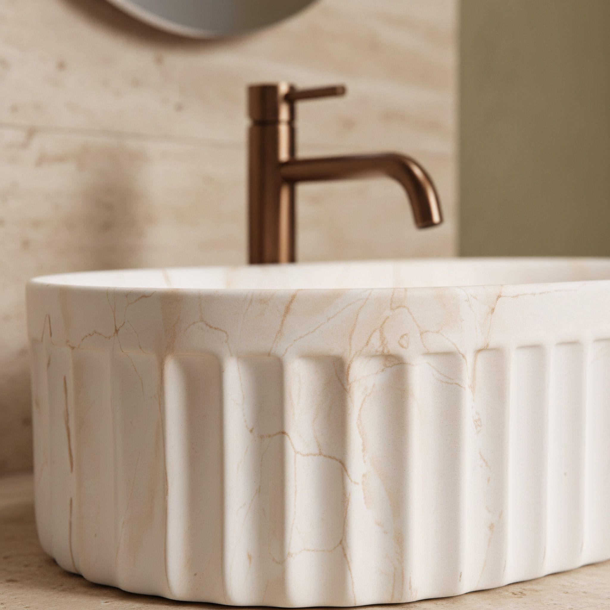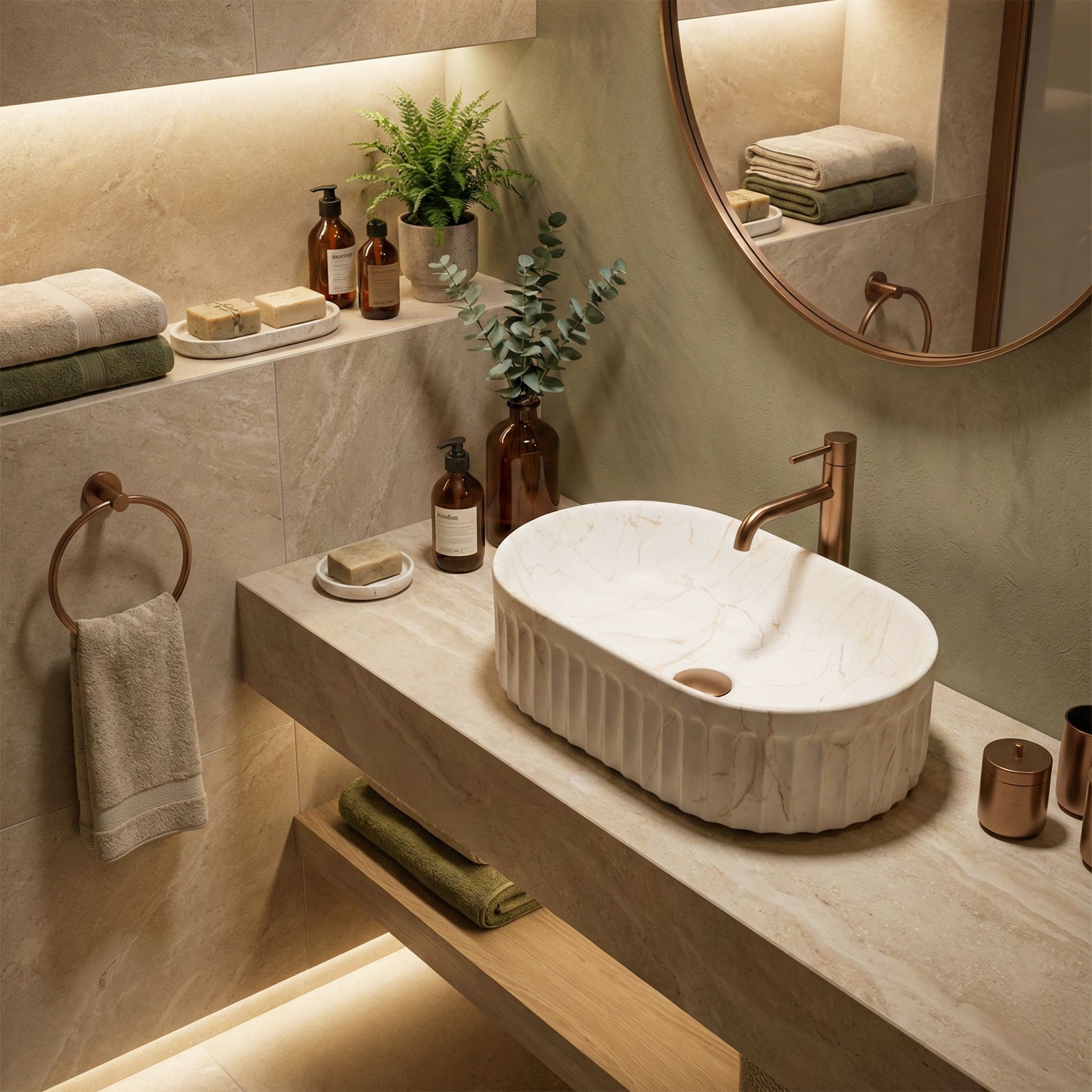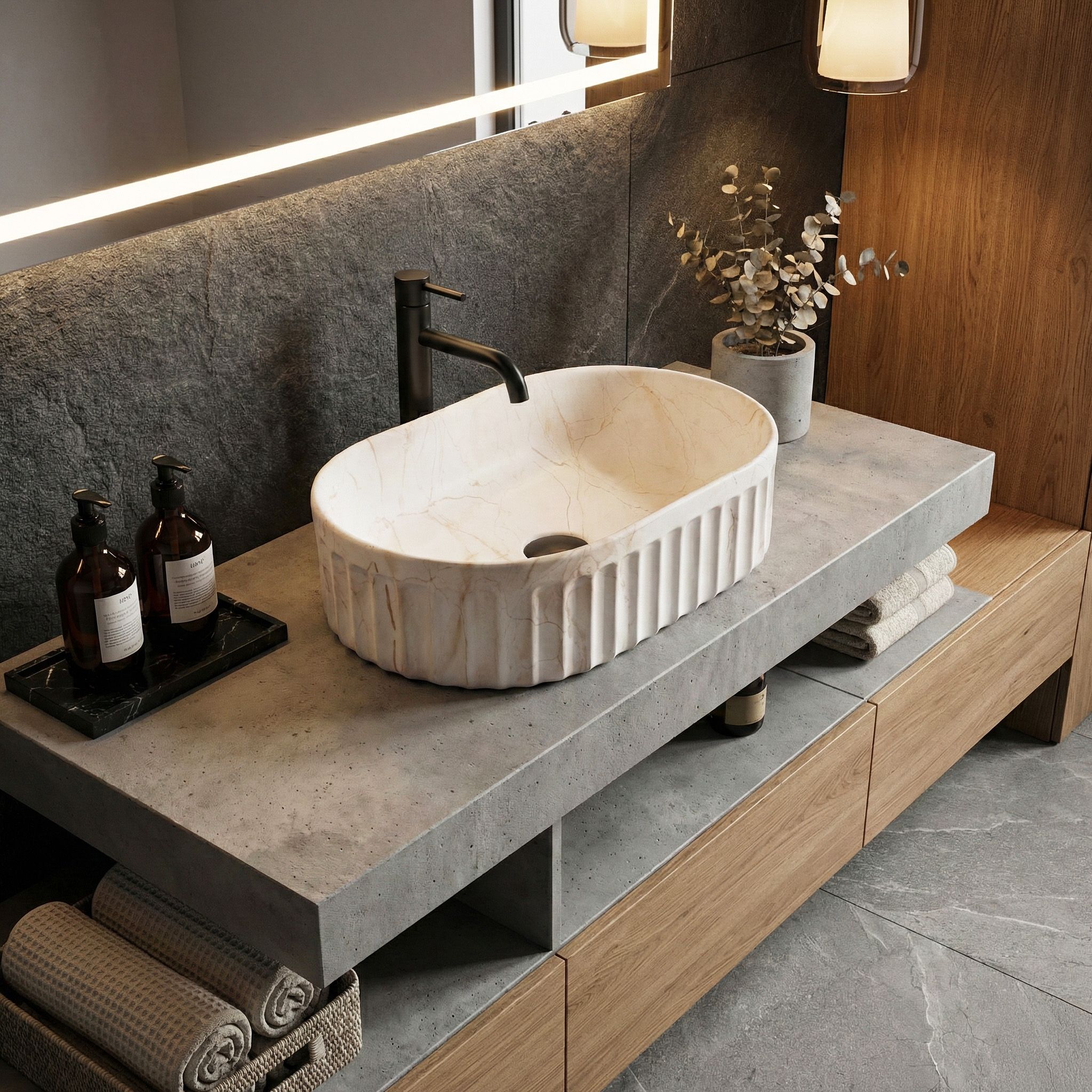 Objavte jedinečný dizajn a funkčnosť vďaka umyvadlu na dosku Georgia. Tento model spája overenú, odolnú keramiku s najnovšími interiérovými trendmi. Vyniká charakteristickou ryhovanou vonkajšou štruktúrou a jemným matným povrchom so vzorom kameňa, ktorý dodá umývacej zóne moderný a výrazný charakter. Ryhovaná štruktúra – vonkajší povrch misy má zvislé drážky (ryhovanie). Je to veľmi trendový detail, ktorý narúša hladké plochy, opticky odľahčuje tvar a skvele ladí s ďalšími ryhovanými prvkami v kúpeľni, napríklad s čelami nábytku. Matný povrch s kamenným motívom – umývadlo zaujme vzorom imitujúcim prírodný mramor s jemným hrdzavým žilkovaním. Matný povrch je nielen estetický, ale aj praktický na každodenné používanie. Odolná sanitárna keramika – model je vyrobený z kvalitného materiálu s vysokou odolnosťou proti poškriabaniu a poškodeniu, čo zaručuje nemenný vzhľad po dlhé roky. Montáž na dosku – umývadlo je určené na inštaláciu priamo na dosku alebo skrinku. Toto riešenie zvyšuje komfort používania a umožňuje získať viac miesta na kozmetiku okolo misy. Ergonomický oválny tvar – oblé línie bez ostrých hrán uľahčujú odtok vody a každodenné čistenie je rýchle a bezproblémové. Umyvadlo na dosku Georgia je skvelou voľbou pre tých, ktorí hľadajú originálne, no praktické vybavenie. Ryhovaný dizajn a matný kamenný vzor vytvárajú súdržný celok, ktorý bude výrazným prvkom každej modernej kúpeľne.