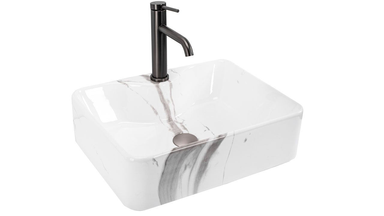 Umývadlo v bielom lesklom prevedení s mramorovým efektom sa navyše vďaka špeciálnej fáze výroby ľahko čistí, je veľmi odolné a má svoj jedinečný vzor.