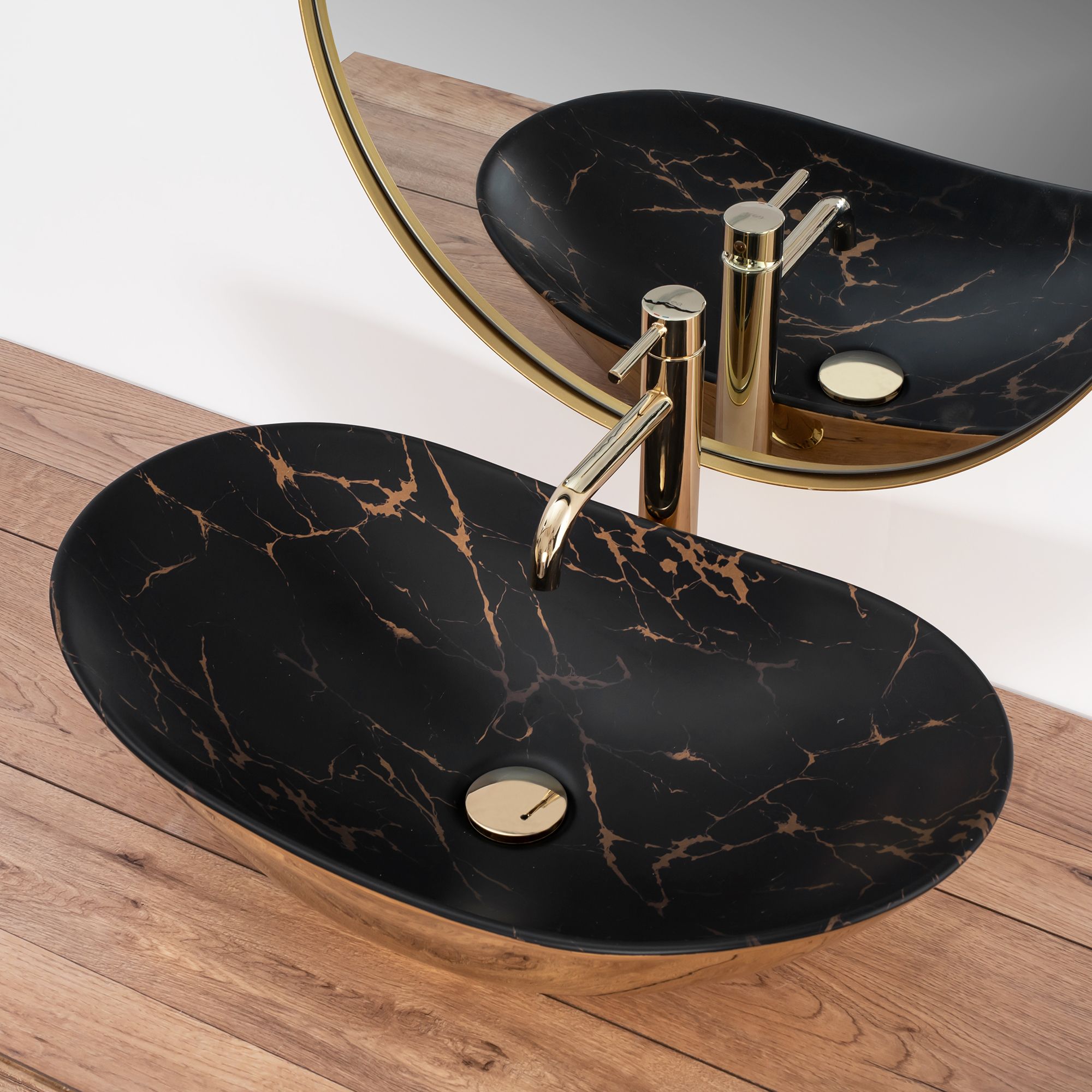 Predstavujeme Vám nové moderné umývadlo na dosku série Royal In Black Marble Gold Umývadlo tvaru elipsy je vyrobené z materiálov najvyššej kvality a jeho vlastnosti splnia všetky vaše požiadavky. Tento model ocení predovšetkým zákazník, hľadajúci nielen funkčné, ale aj estetické riešenie. Umývadlo je určené na montáž na dosku, ale je možné ho kombinovať aj so skrinkou. Umývadlo v zlatom lesklom prevedení sa navyše vďaka špeciálnej fáze výroby ľahko čistí a je veľmi odolné.