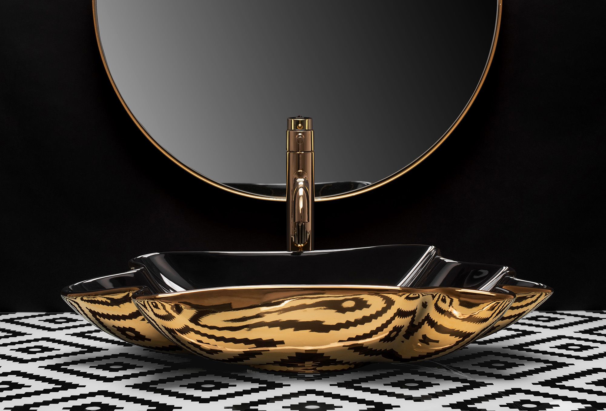 Umývadlo v čiernom lesklom prevedení na vnútornej strane a zlatom lesklom prevedení na vonkajšej strane sa navyše vďaka špeciálnej fáze výroby ľahko čistí a je veľmi odolné.