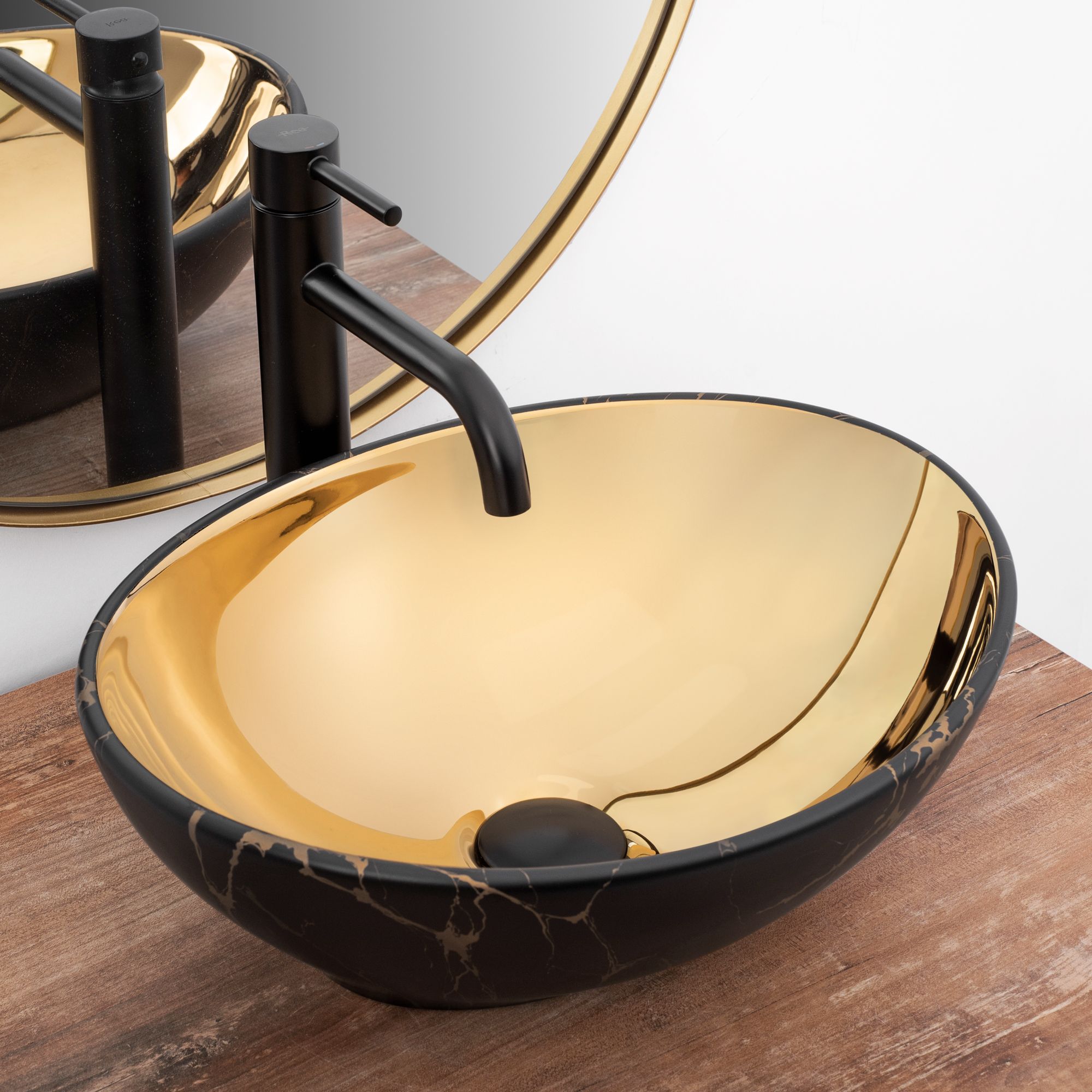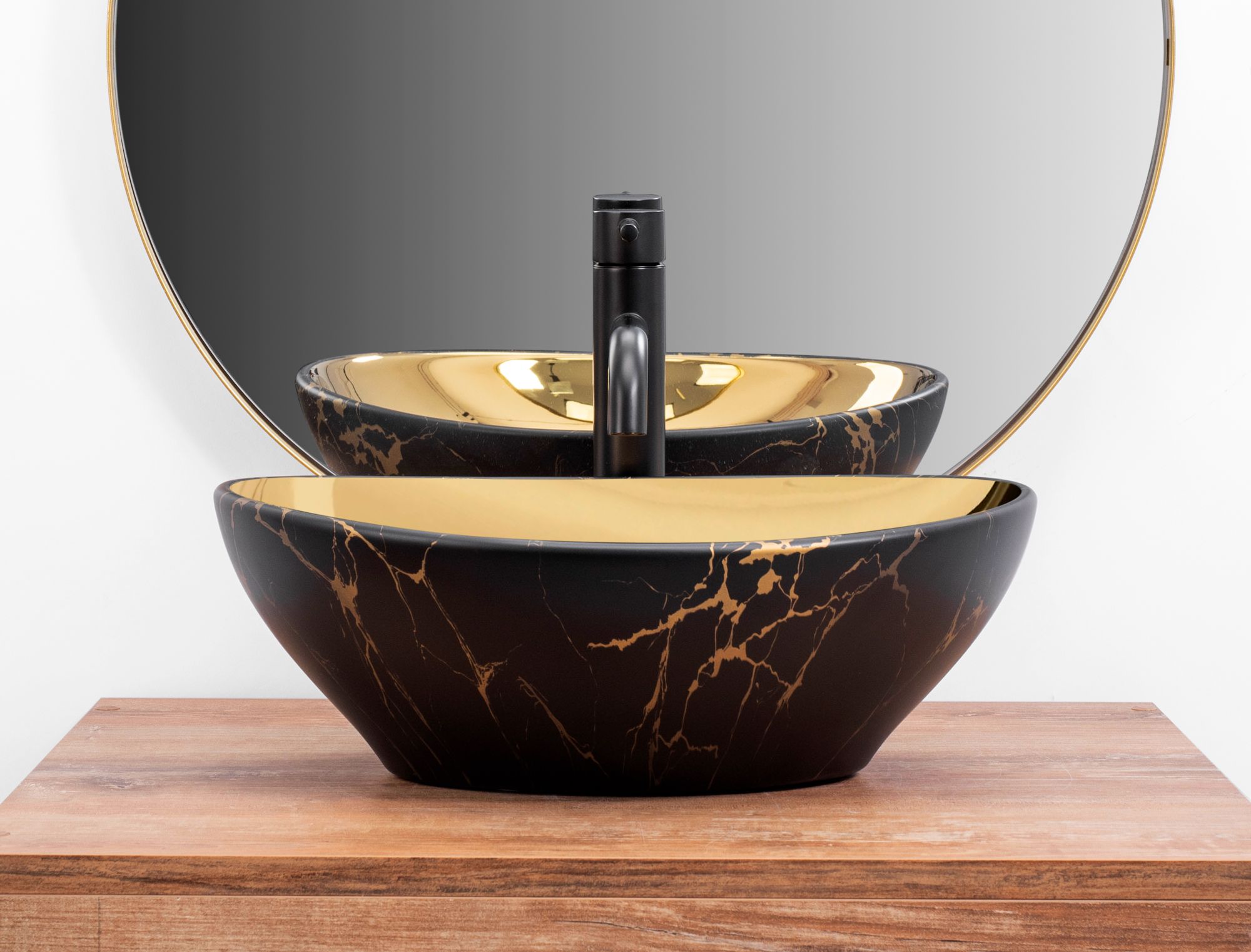 Predstavujeme Vám nové moderné umývadlo na dosku série Rea Sofia. Umývadlo oválneho tvaru je vyrobené z materiálov najvyššej kvality a jeho vlastnosti splnia všetky vaše požiadavky. Tento model ocení predovšetkým zákazník, hľadajúci nielen funkčné, ale aj estetické riešenie. Umývadlo je určené na montáž na dosku, ale je možné ho kombinovať aj so skrinkou. Umývadlo v čiernom lesklom prevedení na vnútornej strane a zlatom lesklom prevedení na vonkajšej strane sa navyše vďaka špeciálnej fáze výroby ľahko čistí a je veľmi odolné.