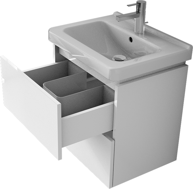Podumývadlová skrinka so zásuvkami otváranými dotykom určená pod umývadlo Jika Cubito 55. Dotykové otv. je možno zameniť za tlmené zatváranie za cenu úchytky.